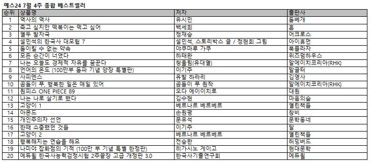| ↑↑ 예스24 7월 4주 종합 베스트셀러 순위 |