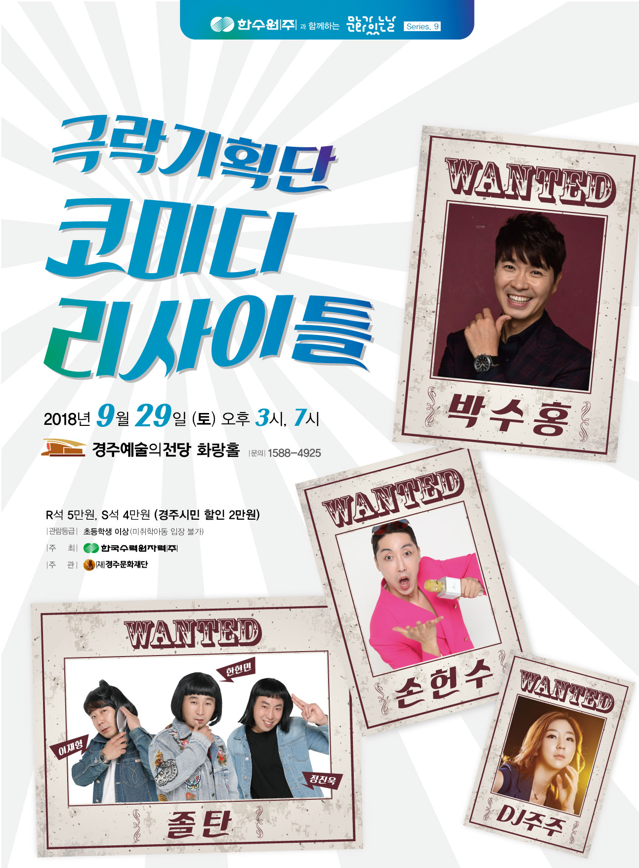 한수원과 함께하는 문화가 있는 날 시리즈 9, ‘극락기획단 [코미디 리사이틀]’은 오는 9월 3일 월요일 오전 10시 경주예술의전당 홈페이지 및 인터파크 티켓을 통해 오픈한다.