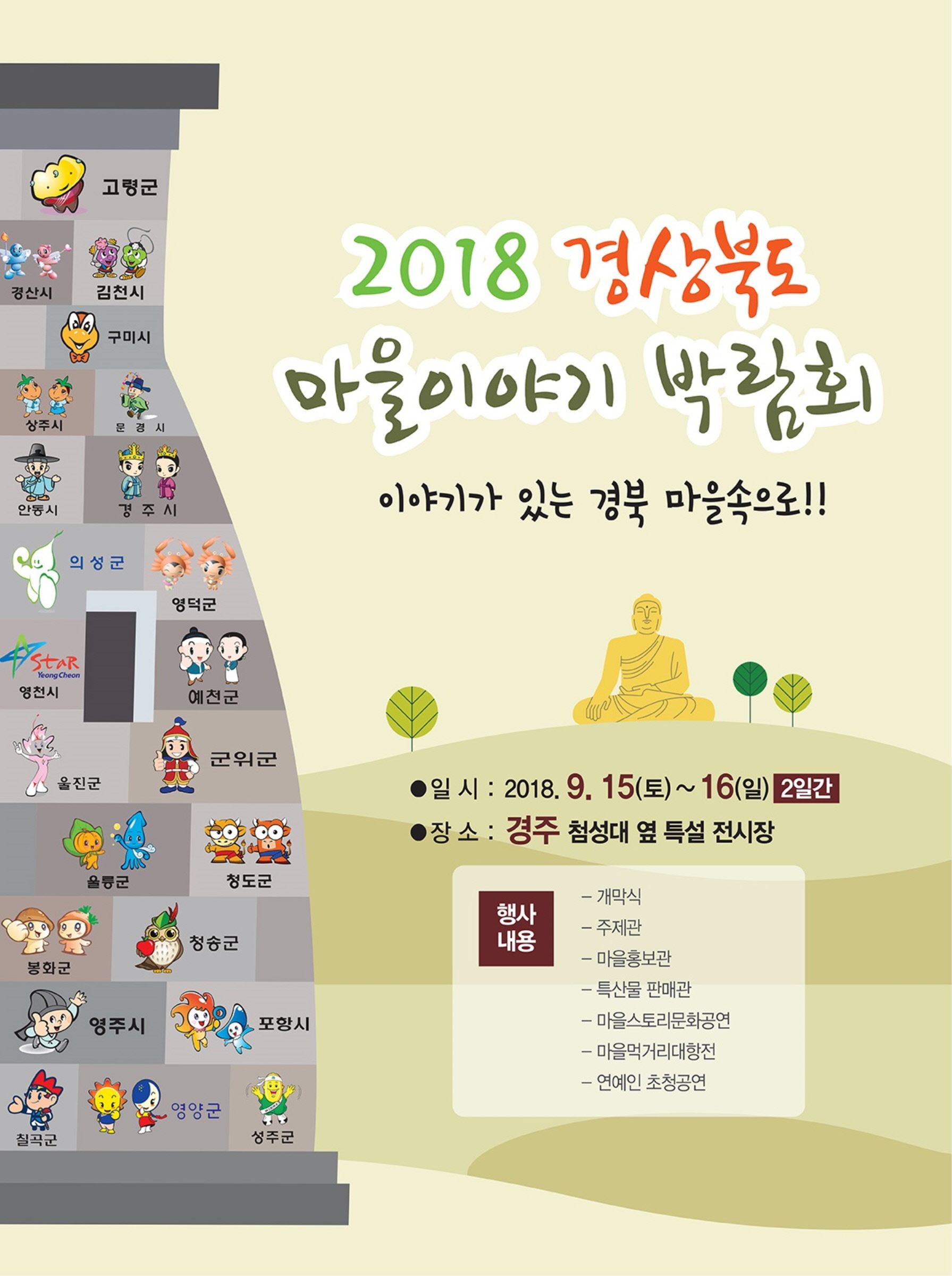【경주=미디어인경북】김동철 기자 = 경상북도 각 시군의 대표마을 22곳의 이야기가 한 곳에 모이는 ‘2018 경상북도 마을이야기 박람회’가 오는 15일부터 16일 이틀간 경주 첨성대 일원 역사유적지구에서 열린다.