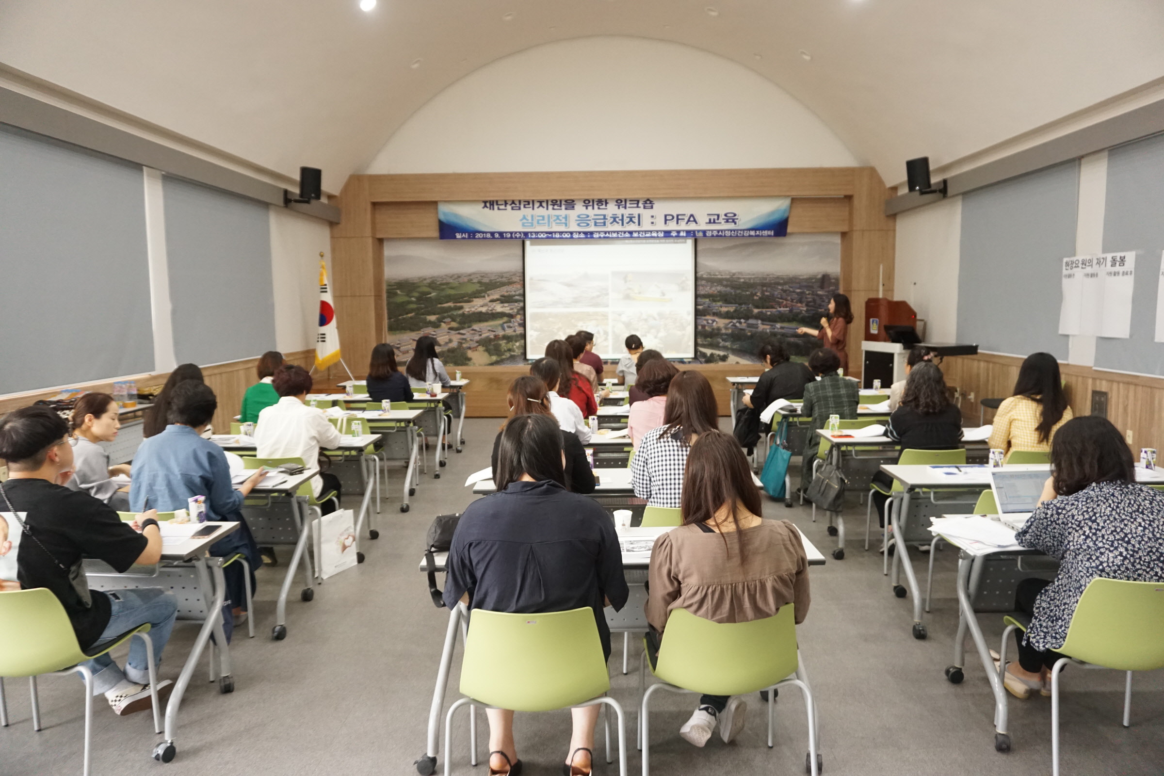이날 교육에서는 재난정신건강지원 전문가인 박해인, 최선우 연구원을 강사로 초청해 정신건강전문요원, 보건교사, 상담교사 등 실무자를 대상으로 ‘심리적 응급처치 : PFA 이론 및 실습’이라는 주제로 심리적 응급처치의 일반적 행동 지침, 실습교육, 현장요원 보호와 자기관리에 대해 알아보는 시간을 가졌다.