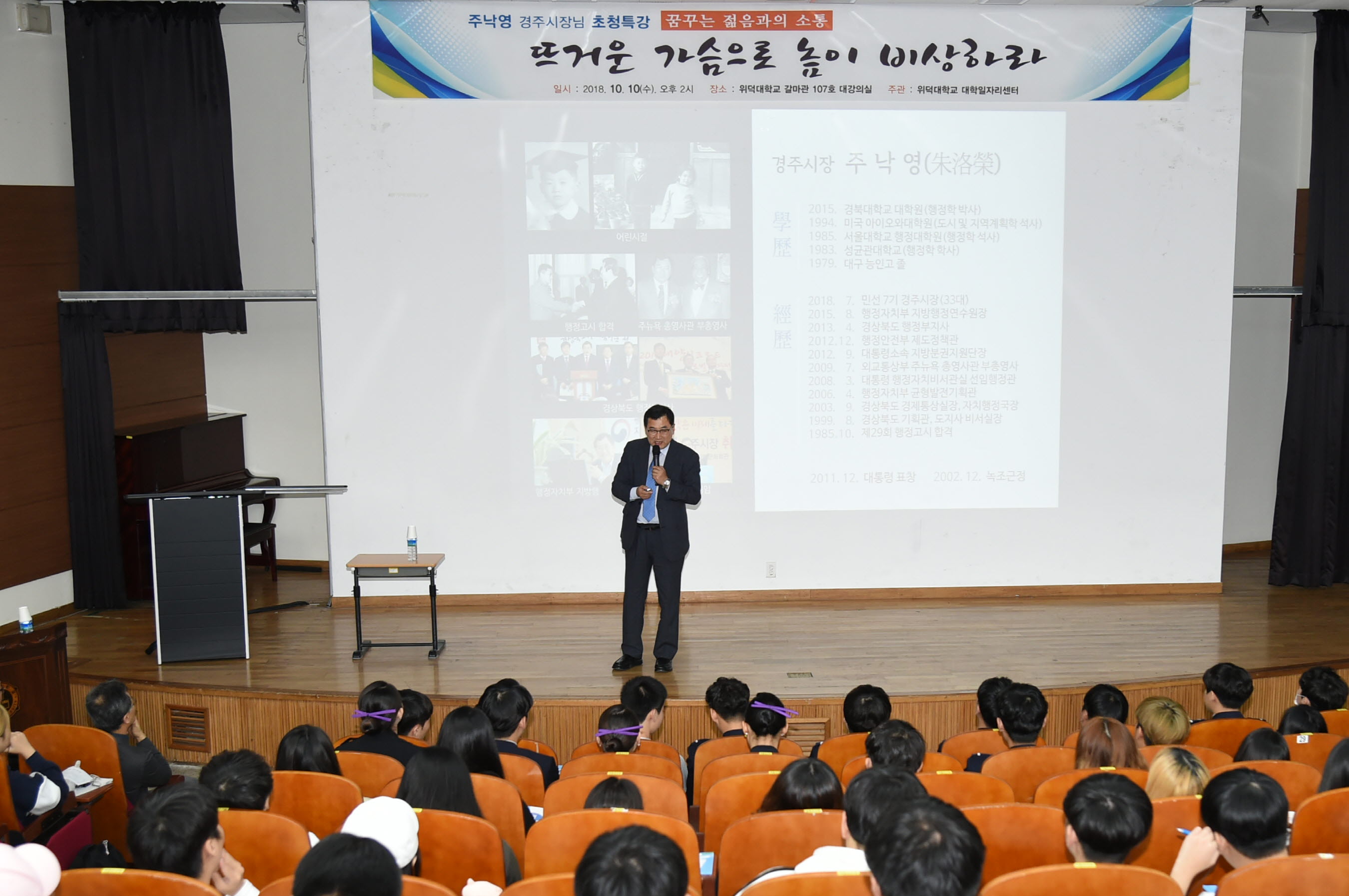 【경주=미디어인경북】김동철 기자 = 주낙영 경주시장이 10일 위덕대학교 갈마관에서 대학생 200여명을 대상으로 ‘뜨거운 가슴으로 높이 비상하라“는 주제의 소통 특강을 가졌다.