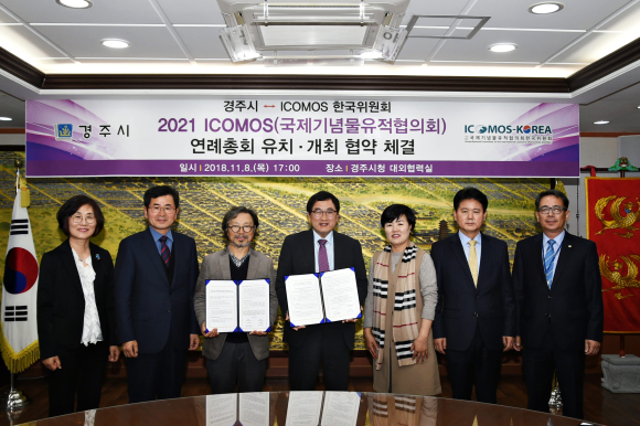 【경주=미디어인경북】김동철 기자 = 경주시(시장 주낙영)는 8일 대외협력실에서 ICOMOS(Internaional Council On Monuments and Sites, 국제 기념물 유적 협의회) 한국위원회(이하, 한국위원회)와 양 기관 대표 및 관계자 7명이 참석한 가운데 2021년 ICOMOS 연례총회의 유치와 관련한 업무협약을 체결했다.