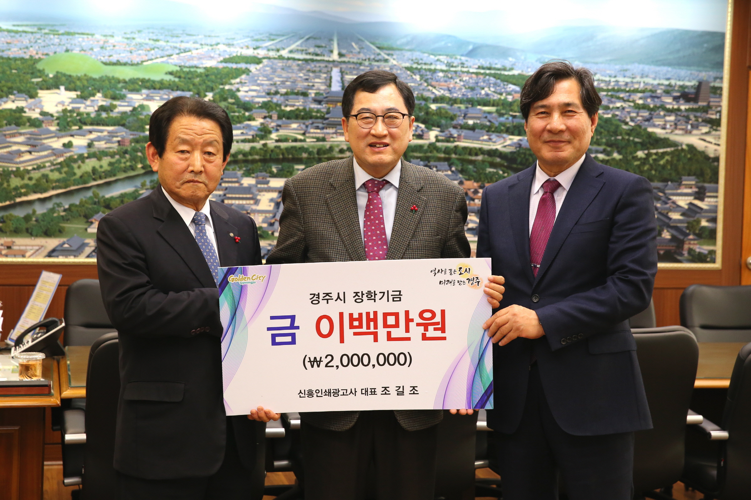【경주=미디어인경북】 김동철 기자 = 조길조 전 경주시행정동우회 회장(신흥인쇄광고사 대표)(전 경주시행정동우회 회장)이 27일 경주시를 방문해 지역 인재 육성에 써달라며 장학금 200만원을 경주시장학회에 기탁했다.
