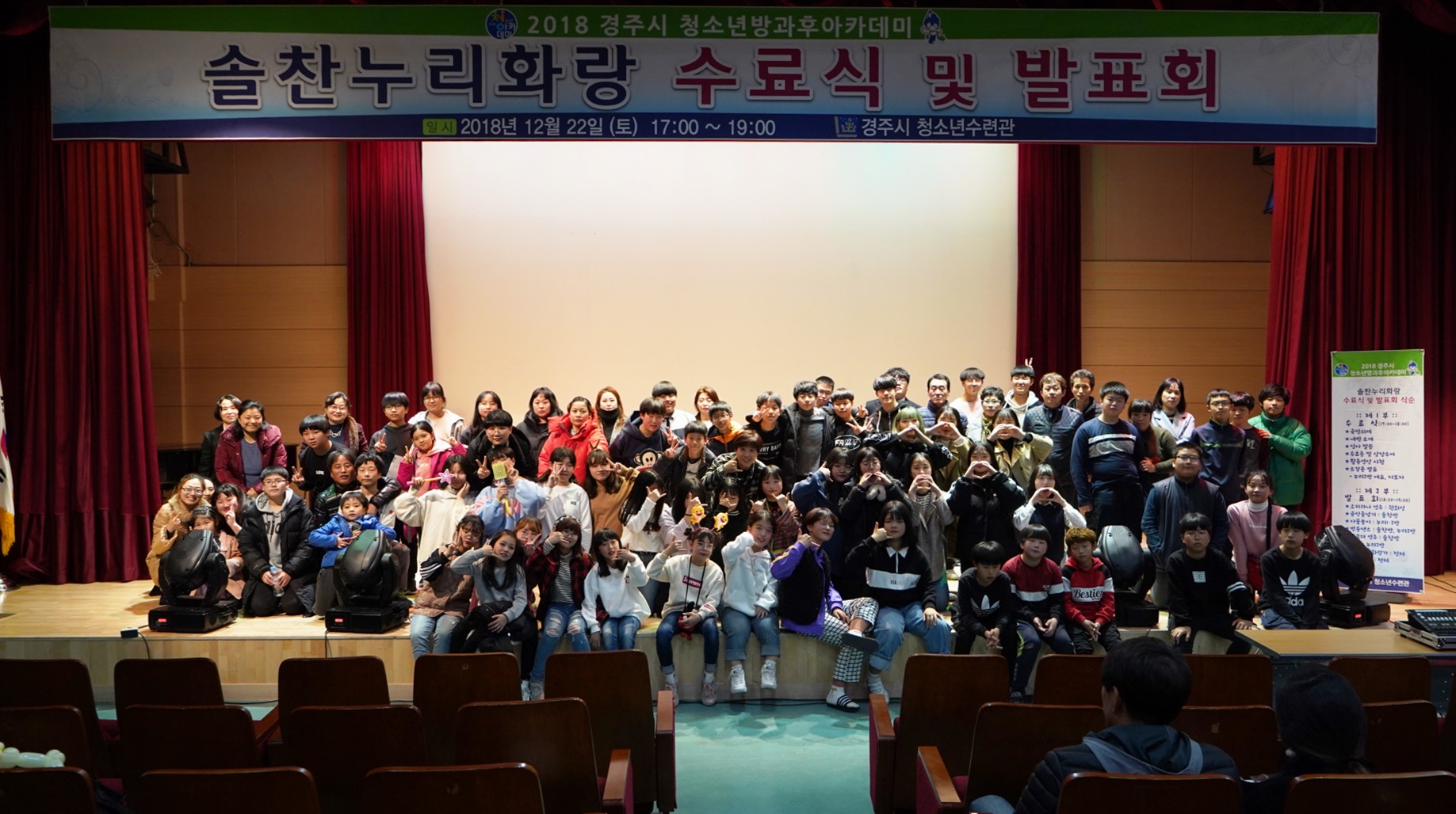 【경주=미디어인경북】 김동철 기자 = 경주시 청소년방과후아카데미는 지난 22일 청소년 및 학부모, 강사 등 110여 명이 참석한 가운데 한 해를 마무리하는 ‘솔찬누리화랑 수료식 및 발표회’를 가졌다.