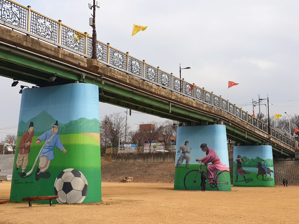 이에 시는 하천과 인접한 교각 3면에는 형산강의 자연경관에 어울리는 왜가리, 황포돛대, 폭포 벽화를 그리고, 자전거도로와 산책로가 접한 둔치의 교각 6면은 김유신 장군과 관련된 역사 기록과 화랑의 모습을 천년고도 경주의 이미지에 맞게 현대화하여 축구와 활쏘기, 말타기하는 모습으로 표현했으며, 황룡사 금당벽화로 유명한 솔거의 노송도도 작업했다.