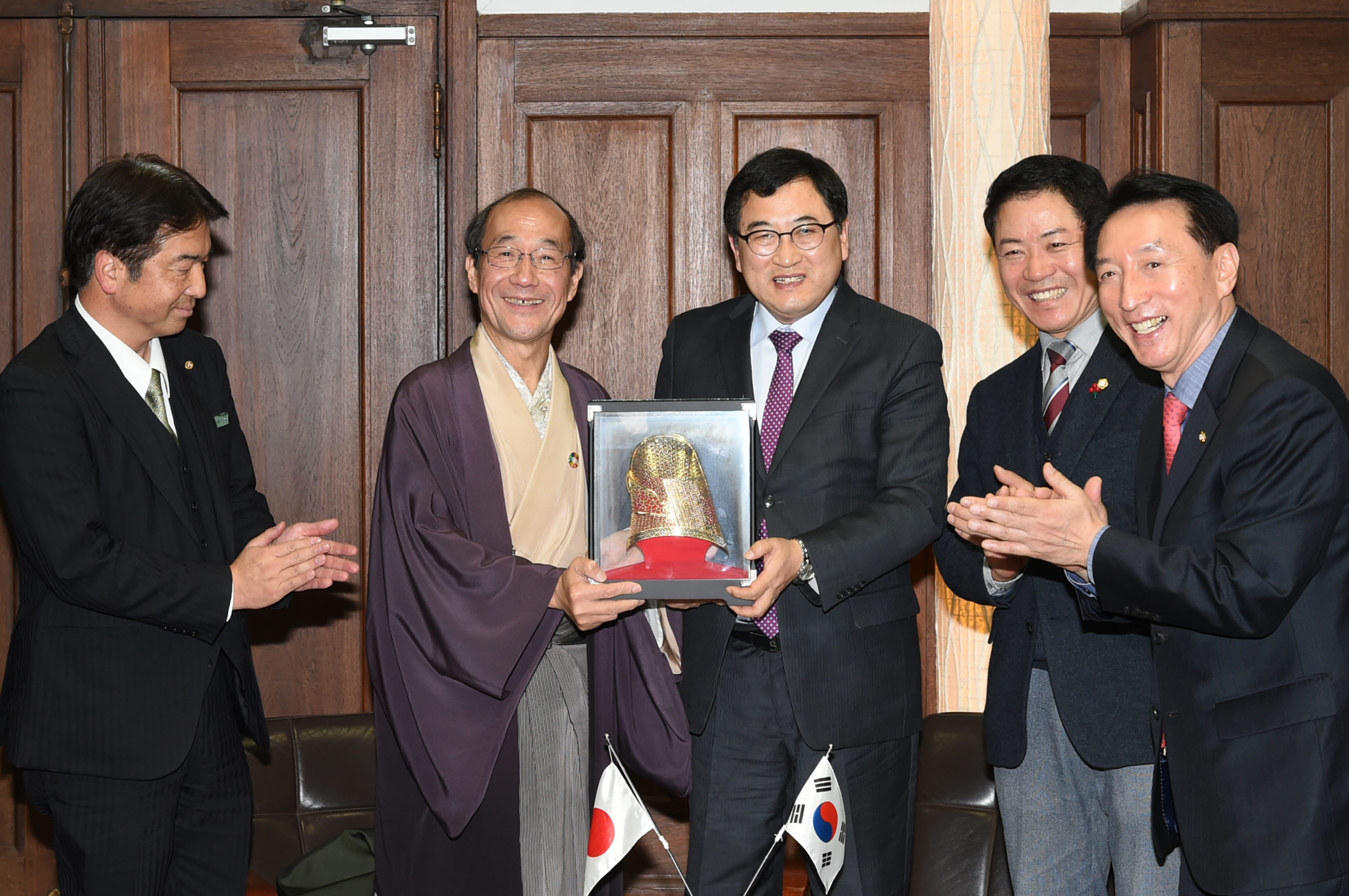 | ▲주낙영 경주시장이 12월 17일 김석기 국회의원, 윤병길 시의장과 함께 카도가와 교토시장과 만나 경주-교토 뱃길연결사업 추진과 교류활성화에 합의하고 기념사진을 찍고 있다. |