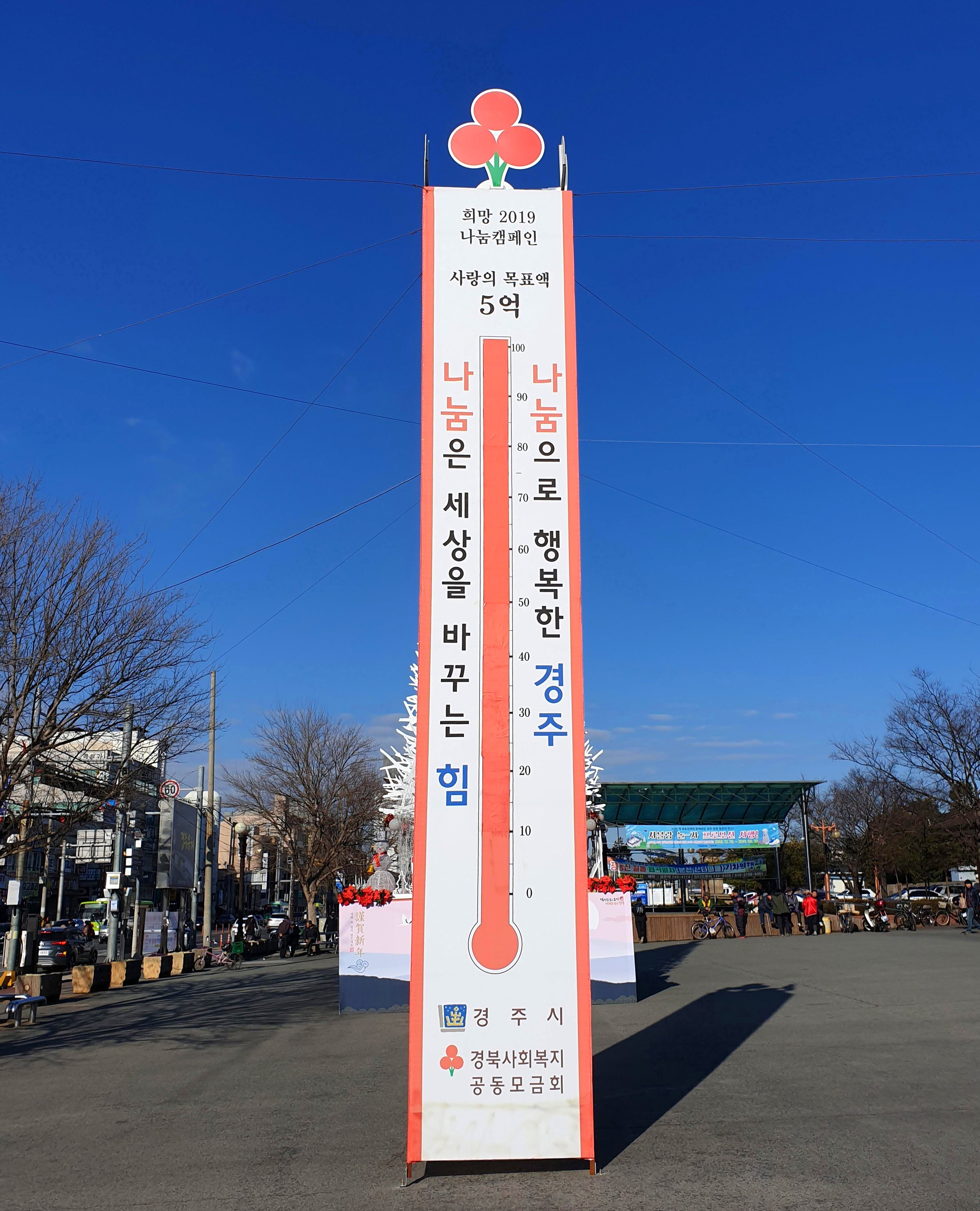 시는 연말연시 이웃과 함께하는 나눔문화 확산을 위해 경주역 광장에 사랑의 온도탑을 설치하고 지난 11월 20일부터 2019년 1월 31일까지 ‘희망 2019 나눔 캠페인’을 집중적으로 실시해 왔다.