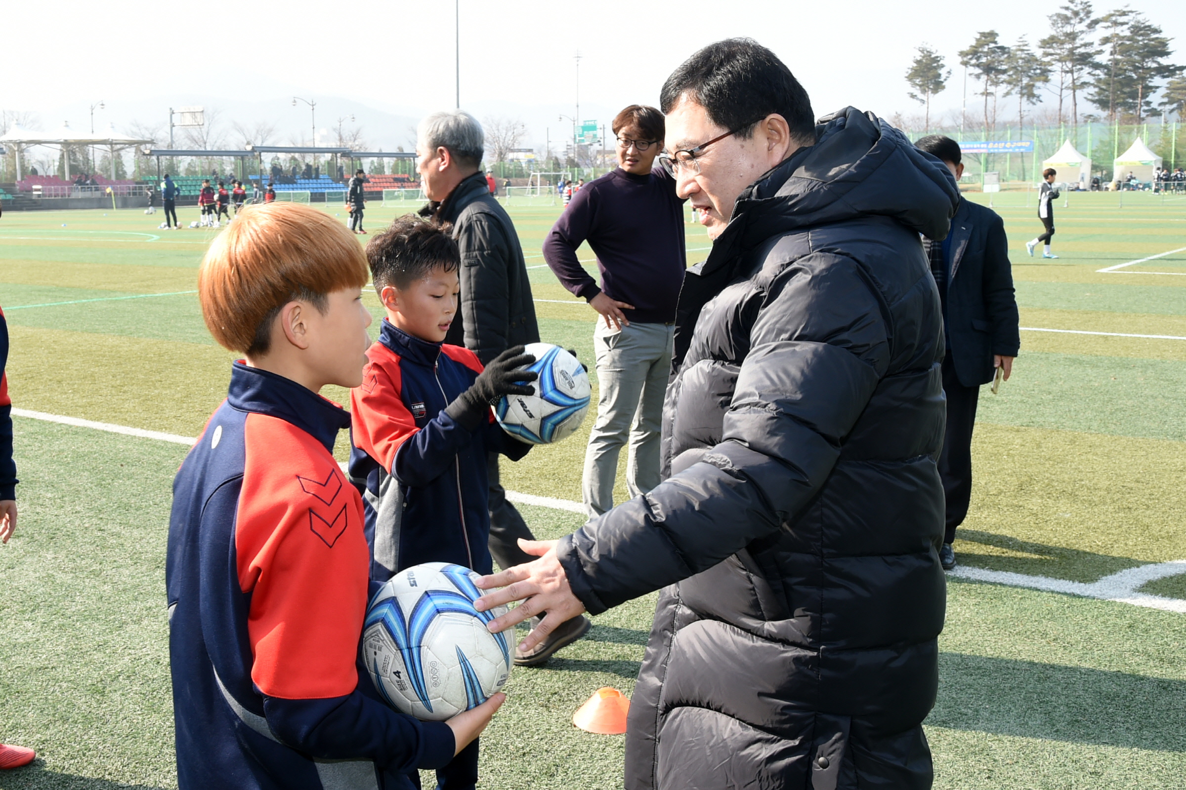 | ▲주낙영 경주시장이 13일 경주컵 동계클럽 유소년 축구대회가 열리는 축구공원을 찾아 선수들을 격려하고 있다. |