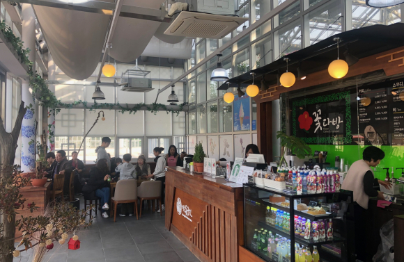 | ▲동궁원의 꽃다방에서 관광객이 차를 마시고 있다. |