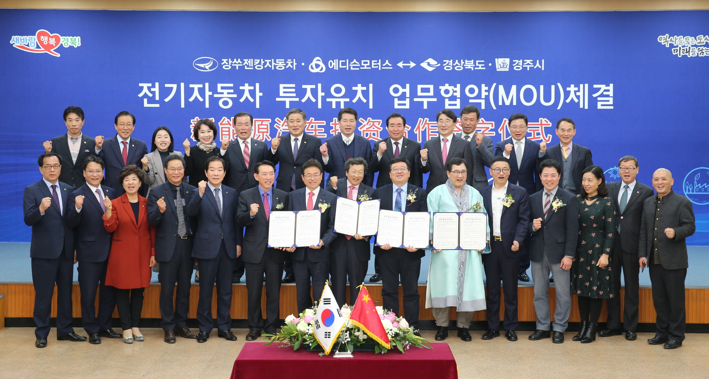 6일 경주시청 대회의실에서 이철우 경북지사, 주낙영 경주시장, 중국 장쑤젠캉자동차유한공사 장 다오린 이사장, 에디슨모터스(주) 강영권 회장, 김석기 국회의원, 윤병길 시의장, 도․시의원, 기업관계자 등 100여명이 참석한 가운데 전기자동차 제조공장 설립을 위한 투자양해각서를 체결했다.