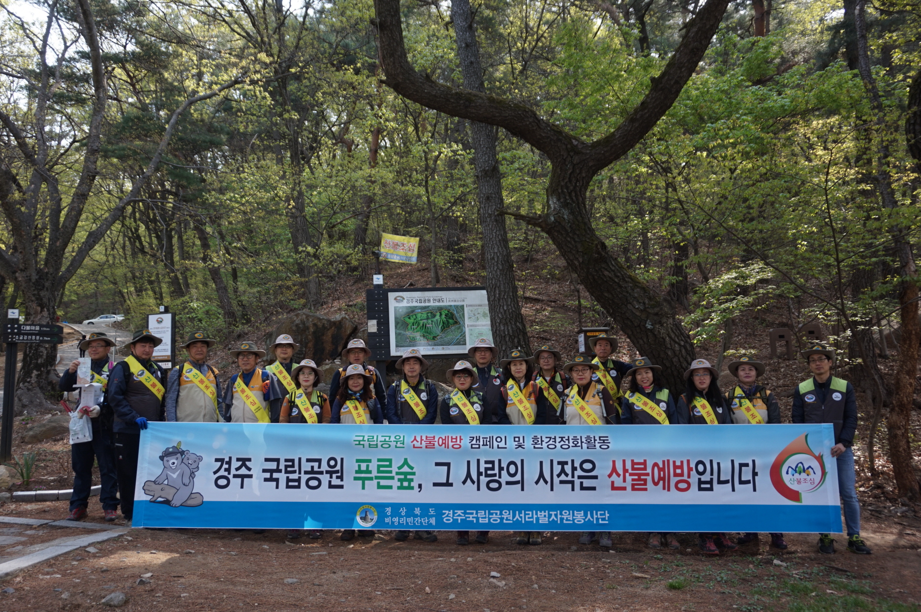 봄철 건조한 날씨로 화재 위험성이 높아진 만큼 산불 화재에 대한 경각심을 고취시키고자 국립공원 탐방객을 대상으로 인화물질 소지 및 흡연행위 금지 안내 캠페인 활동과 함께 황사마스크 등의 홍보용품을 배부 하였으며, 탐방로 및 유적지 주변 등에 방치된 쓰레기를 수거하는 등 환경정화 활동도 병행 했다.