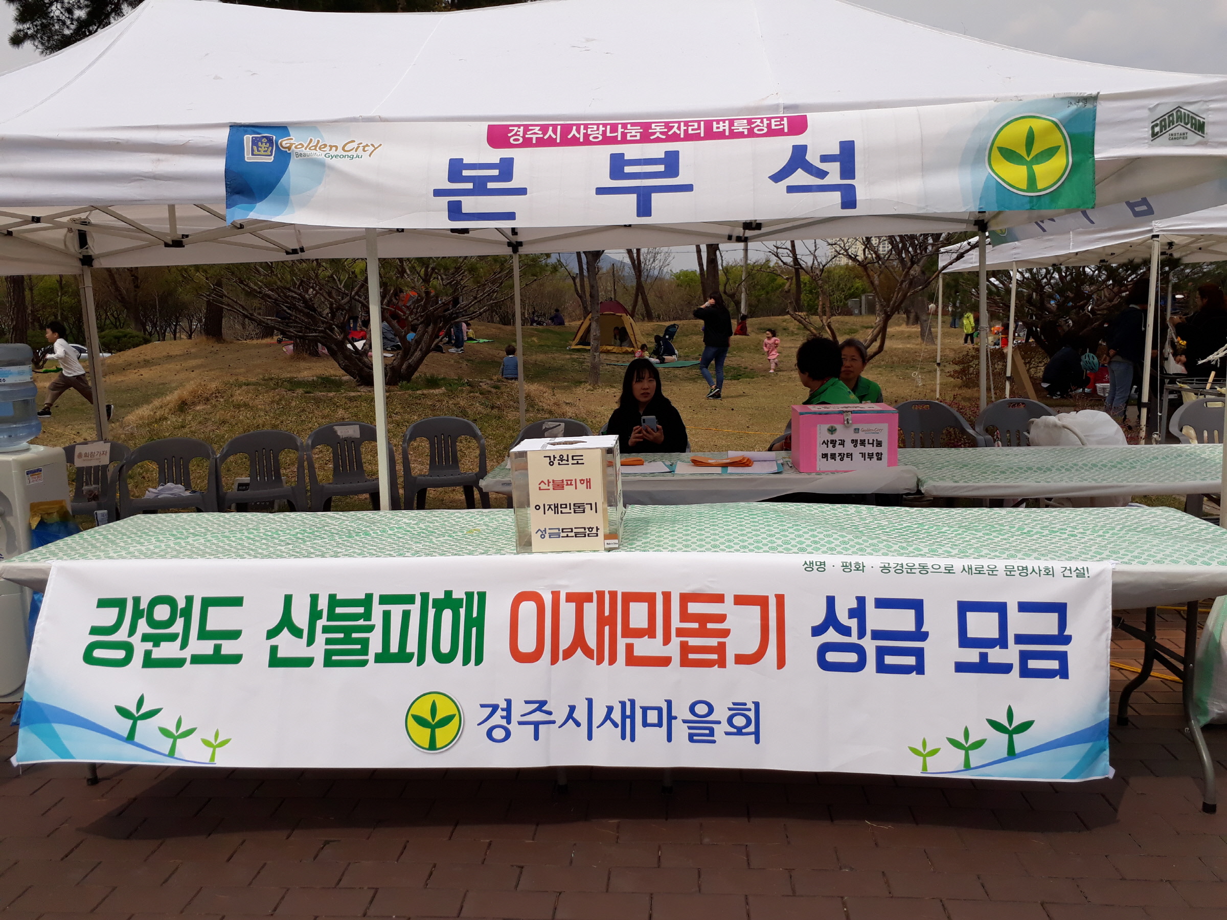 강원도 산불발생 후 경주시새마을회는 피해 주민을 돕기 위해 성금을 모금하기로 결정하고 경주시새마을회 130만원, 새마을지도자경주시협의회에서 115만원, 경주시새마을부녀회 115만원, 새마을문고경주시지부 40만원, 직장공장협의회에서 100만원, 경주시민 사랑나눔 벼룩장터에서 모은 기부금 214,600원을 합쳐 총 5,214,600원을 전달했다.