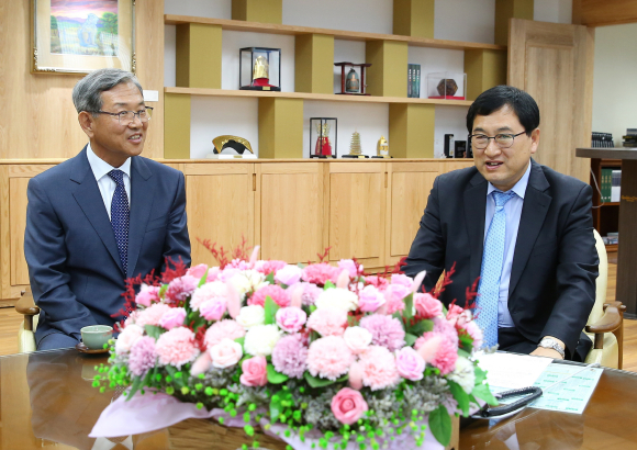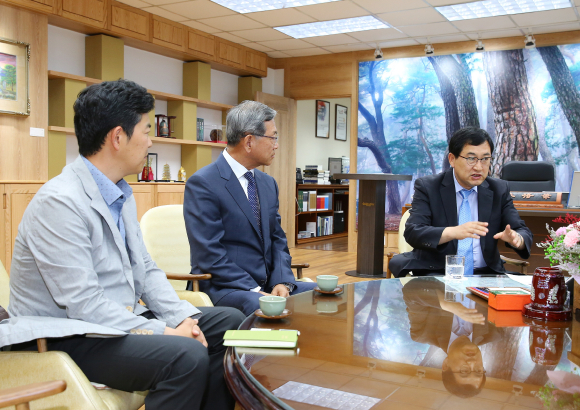 | ▲주낙영 경주시장, 경제살리기 위해 기업과의 소통.맞춤지원 강조(주낙영 경주시장이 금탑산업훈장 수상 업체인 (주)에스앤비 이승지대표와 좌담회를 갖고 있다. 오른쪽 주낙영 경주시장) |