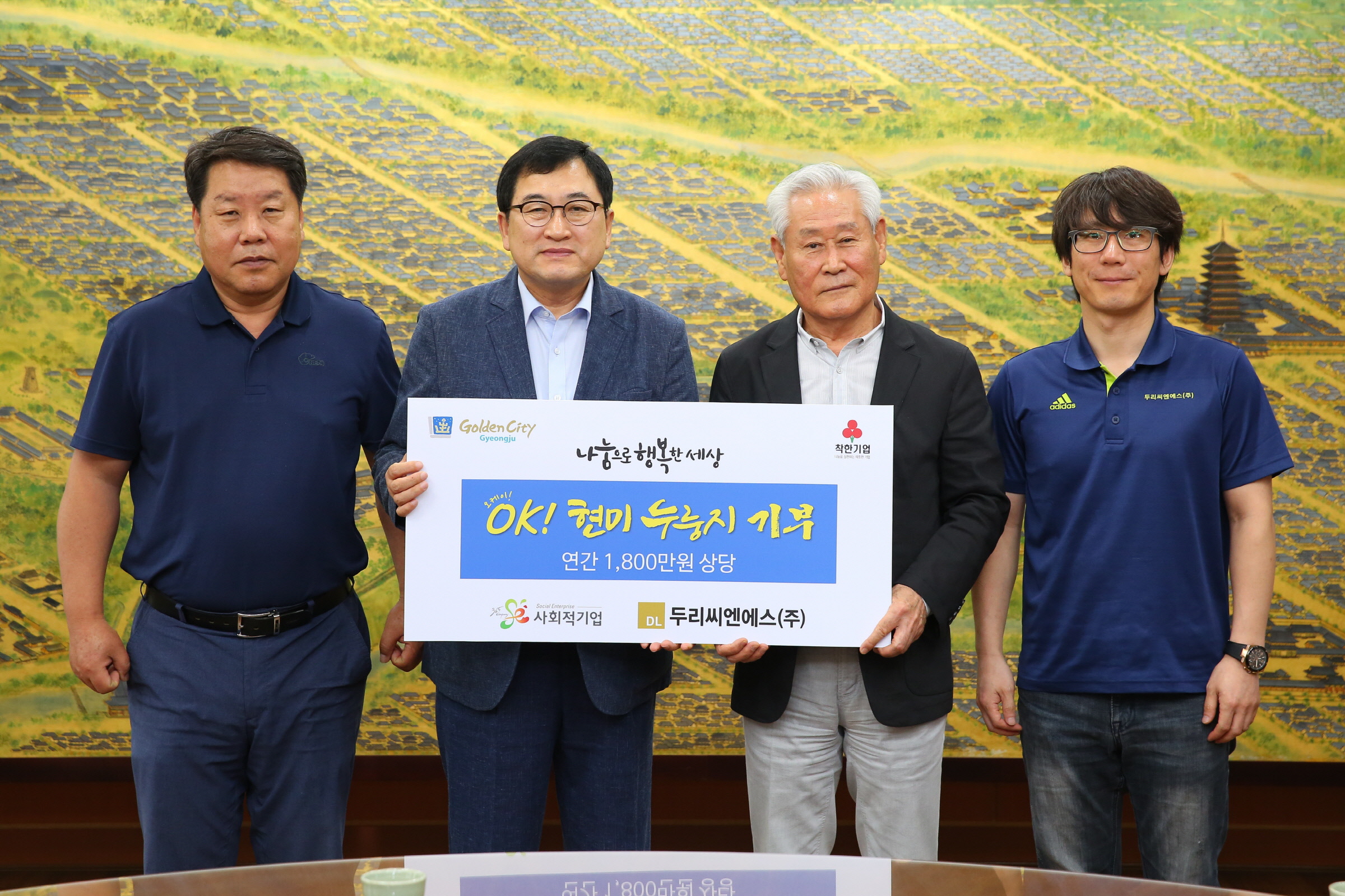 경주시 천북면 오야리에 소재하고 있는 두리C&S는 지난 2016년부터 매달 150만원을 기부하던 사회적 기업으로 올해 4월부터는 매달 150만원 상당의 누룽지를 생산해 읍면동에 기부해오고 있다.