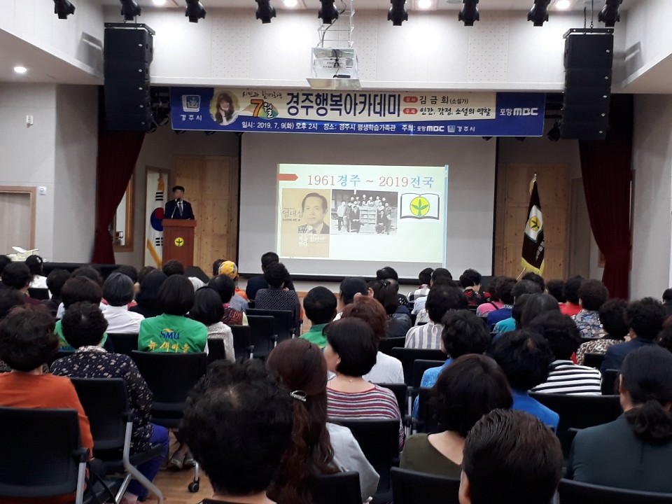 【경주=미디어인경북】 김동철 기자 = 경주시, 경주시새마을회(회장 손지익) 주최, 새마을문고 경주시지부(회장 박임관) 주관으로 경주시 평생학습가족관 대강당에서 문고지도자, 일반시민, 선정도서 작가 등 약 200여명이 모인 가운데 2019년 7월 09일(화)14:00 경주시 행복아카데미 프로그램으로 『2019년 올해의 도서 로 선정된 김금희 작가 초청 특별강연회』가 개최되었다.