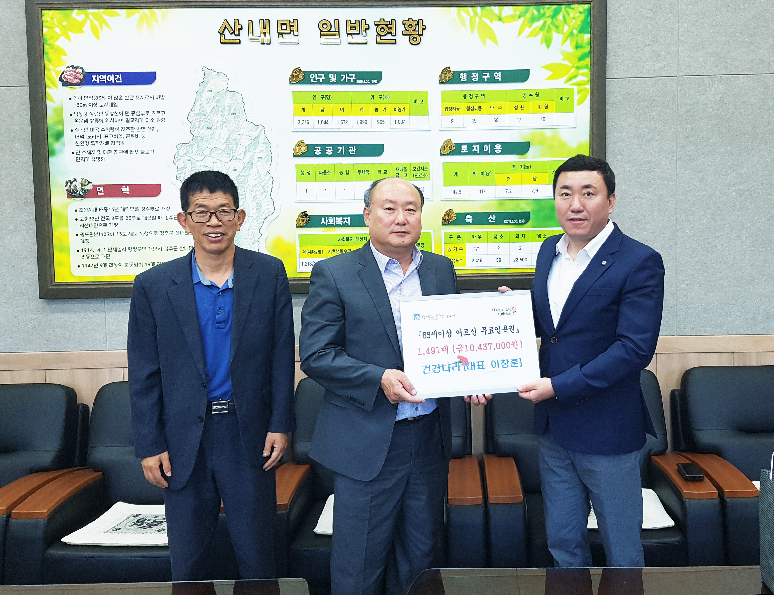 【경주=미디어인경북】 김동철 기자 = 산내면행정복지센터는 26일 사우나 찜질방 ‘건강나라(건천소재. 대표 이창훈)’에서 추석명절을 맞아 산내면 거주 만65세 이상 노인들에게 무료입욕권 1,500매(10,500천원 상당)를 전달했다고 전했다.