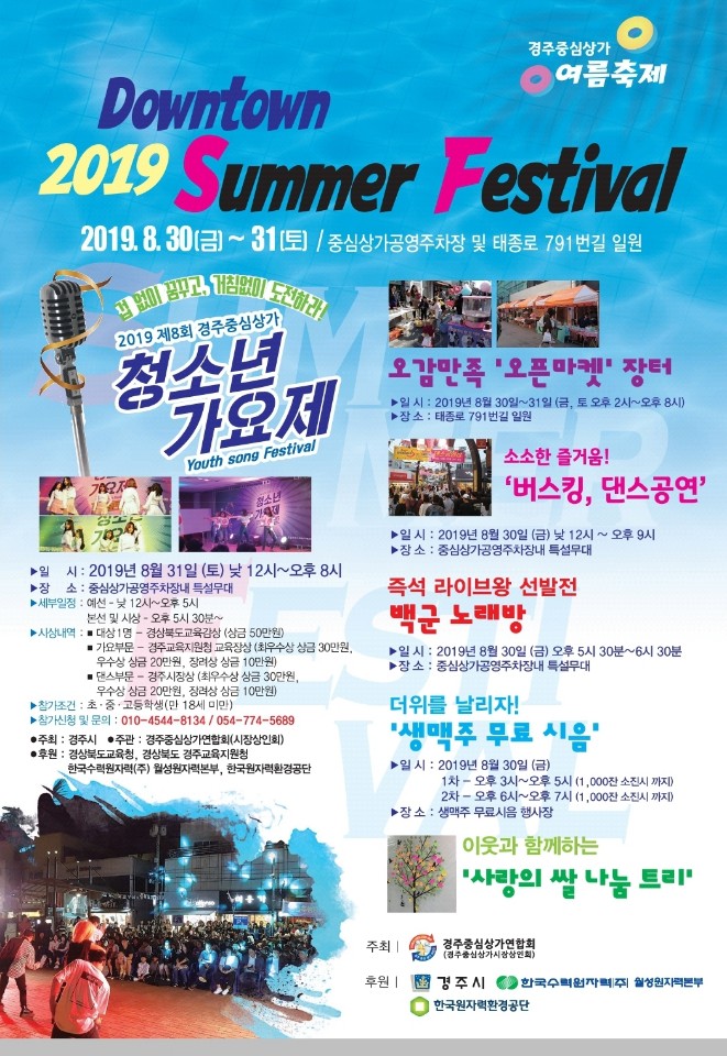 【경주=미디어인경북】 김동철 기자 = 경주시는 오는 30일부터 31일까지 양일간 경주중심상가 공영주차장(황오동 244번지) 일원에서 ‘2019 경주중심상가 여름축제’가 개최된다고 밝혔다.
