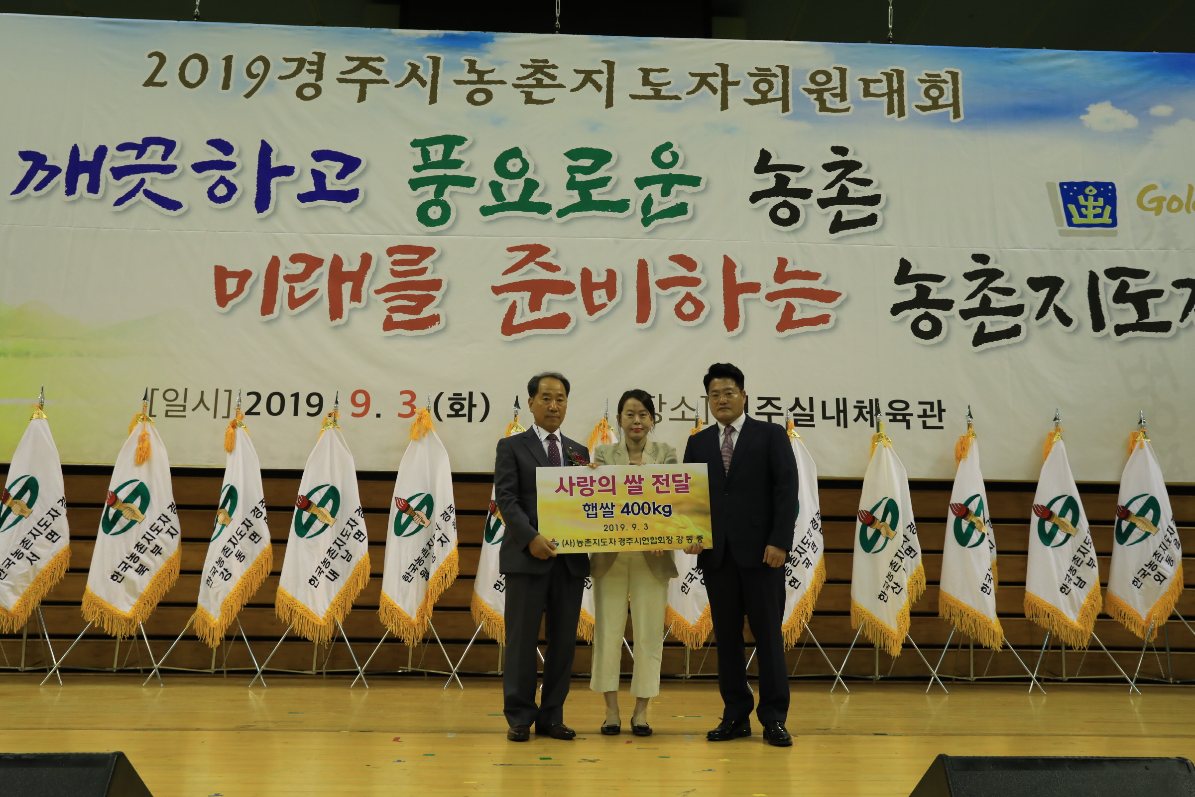 이번 기부는 3일 경주실내체육관에서 농촌지도자회원 등 1,000여명이 참여한 2019년 경주시농촌지도자회원대회 중 ‘사랑의 햅쌀’ 전달식을 통해 천북 대자원과 강동 은혜원에 직접 전달했다.