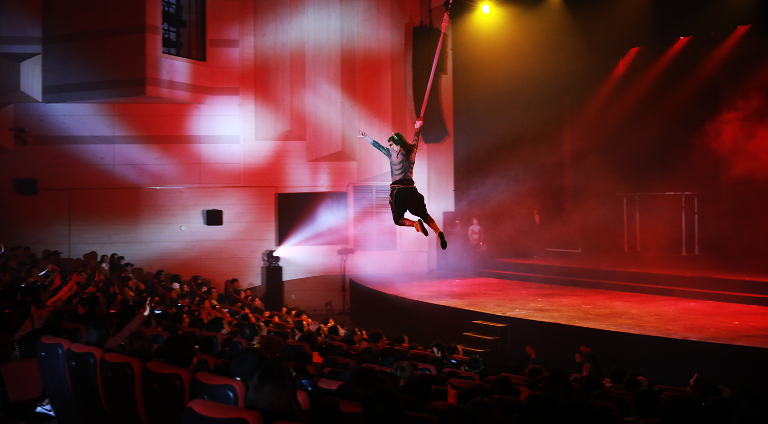 | ▲2019경주세계문화엑스포_ 기간 열린 _인피니티 플라잉_ 공연에서 배우가 와이어를 타고 관객석 위를 날아다니는 공연을 펼치고 있다. |