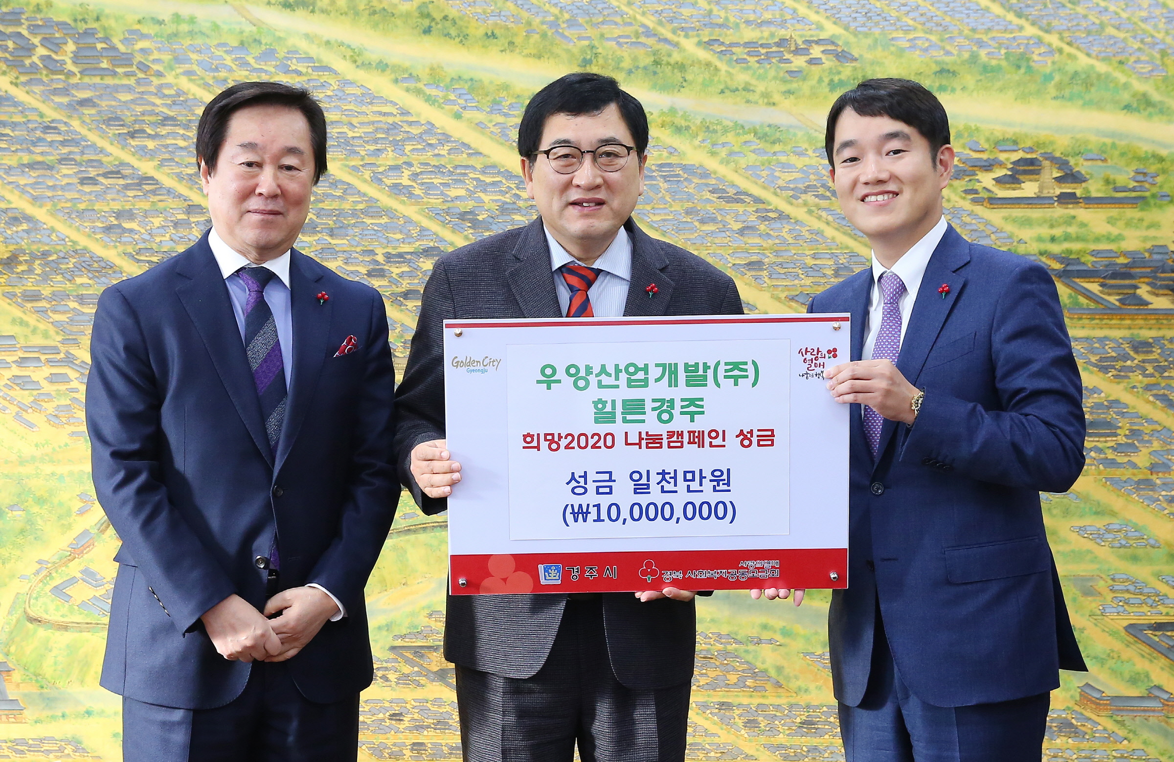 【경주=미디어인경북】 김동철 기자 = 경주시는 우양산업개발(주) 힐튼경주(대표이사 조영준)에서 31일 희망2020 나눔캠페인 성금 1,000만원을 전달했다고 밝혔다.