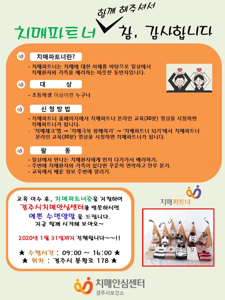 보건소 관계자는 “이번 프로젝트는 경주시민이 자발적으로 치매파트너에 참여한다는 것에 의미가 있으며, 치매친화적인 지역사회를 만들어가기 위한 치매파트너 양성 프로젝트에 많은 시민이 동참했으면 한다”고 전했다.