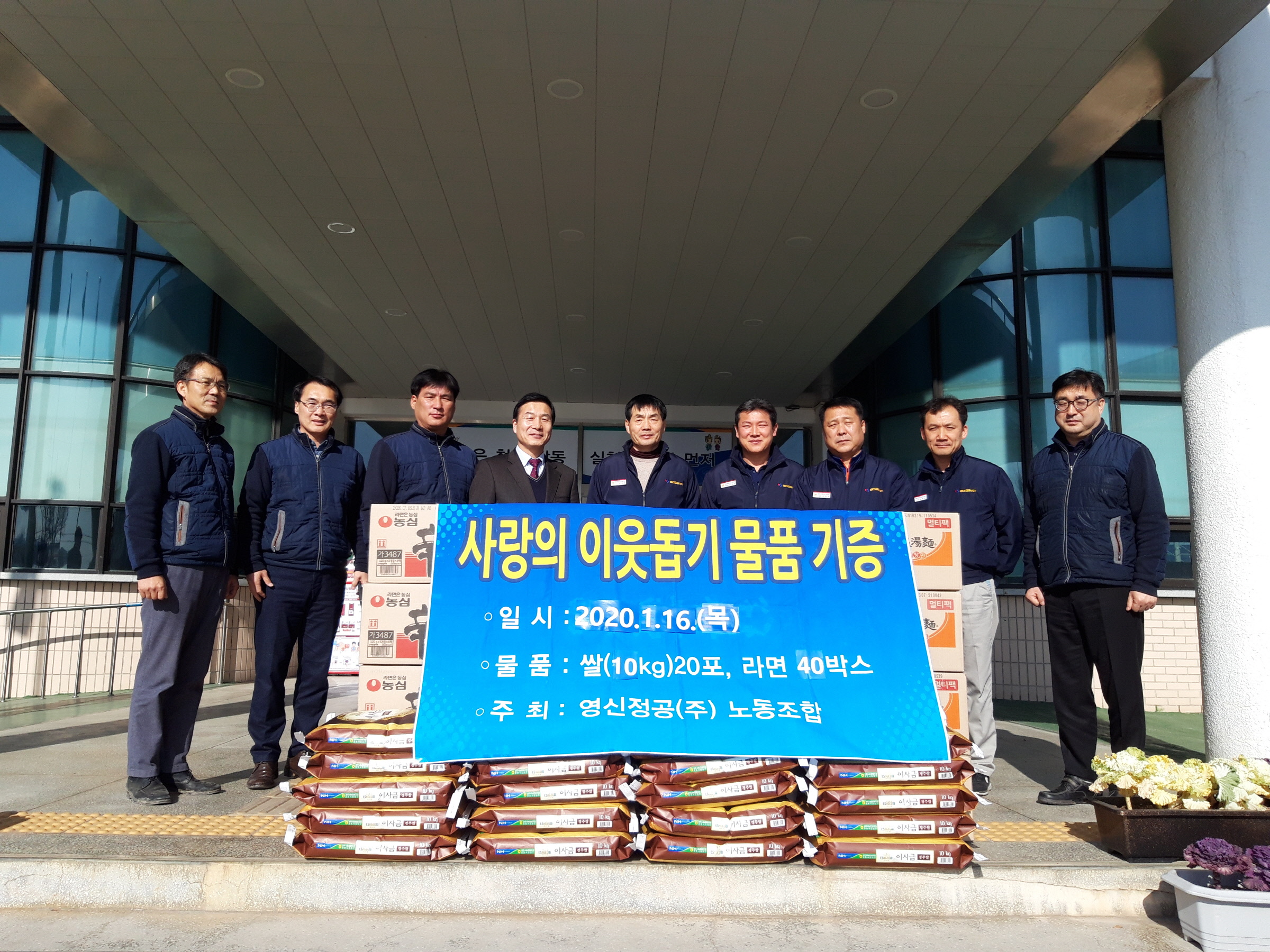 영신정공(주)노동조합은 평소에도 어려운 이웃에게 나눔 봉사를 하고 있으며, 특히 2002년부터 매년 추석과 설 명절에는 천북면에 생필품을 기탁하는 등 기업과 지역주민이 함께 하는 따뜻한 공동체를 만들기 위해 노력하고 있다.
