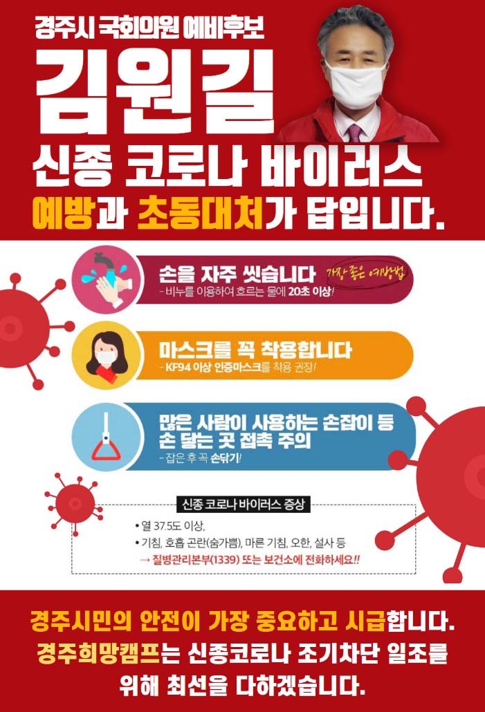 자유한국당 김원길 예비후보자는 오는 2월 7일 경주시 화랑로 53 (성건동) 소재에서 선거사무소의 성공적인 개소식을 위해 많은 준비를 해왔으나 최근 신종 코로나 바이러스 확산방지를 위하여 선거사무소 개소식을 전격 연기한다고 밝혔다.