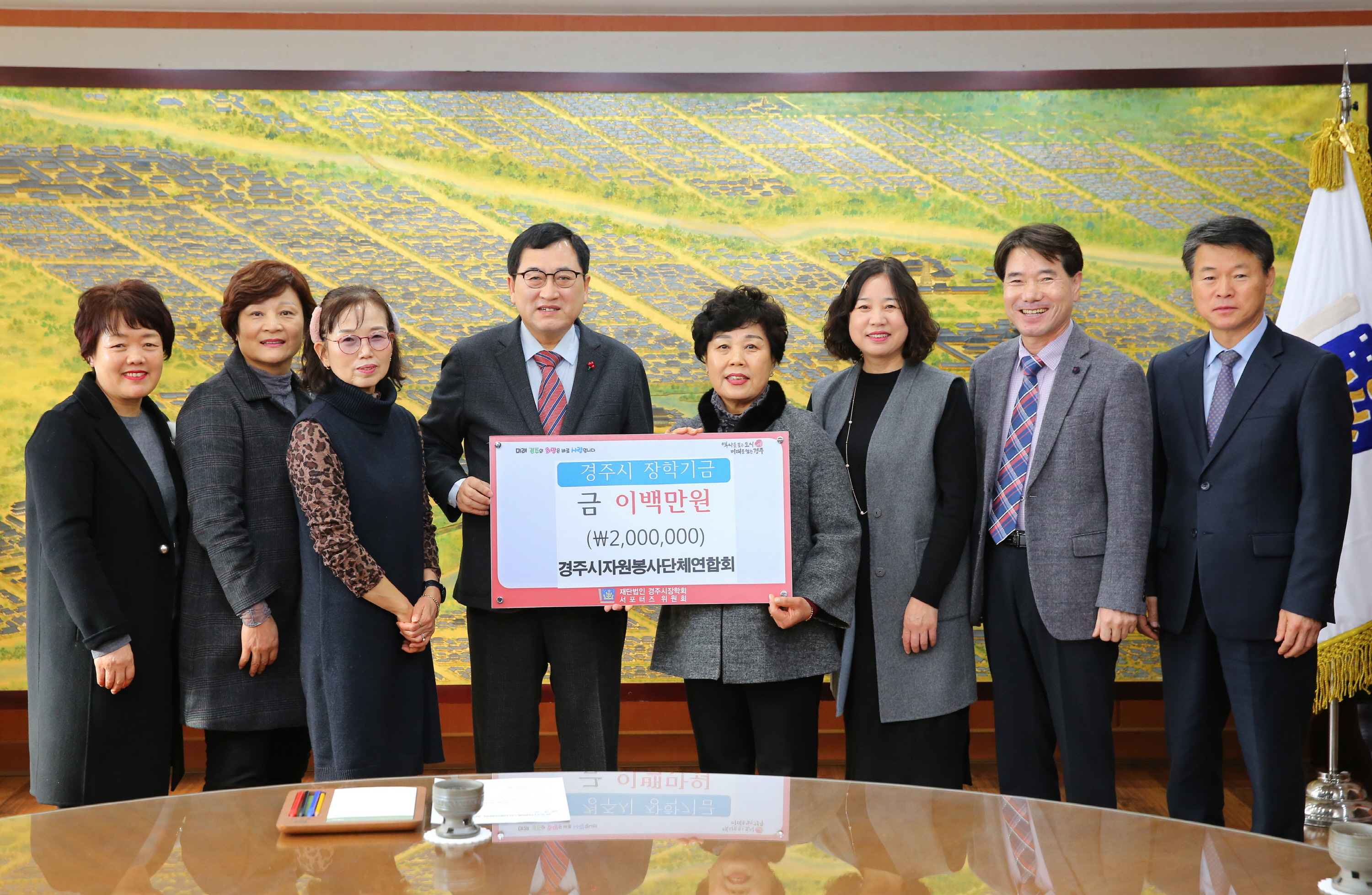 【경주=미디어인경북】 김동철 기자 = 경주시자원봉사단체연합회(회장 김종순)는 6일 미래 경주지역을 이끌어갈 인재육성과 이 지역의 교육발전을 위해 장학금 2백만원을 (재)경주시장학회 서포터즈위원회에 기탁했다.