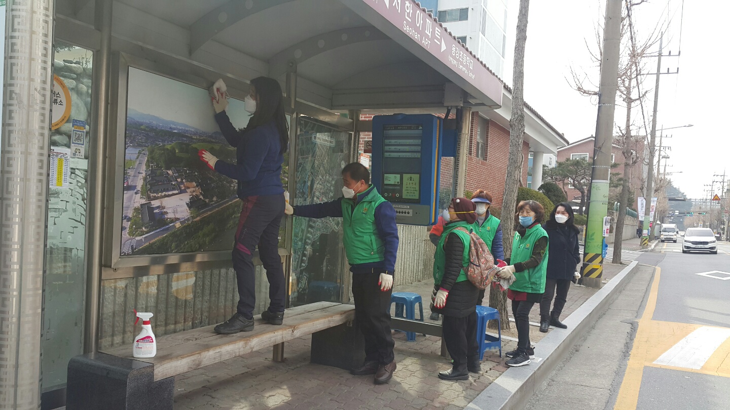 코로나19 감염이 확산됨에 따라 주민과 면역력이 약한 노인들이 많이 이용하는 버스정류장의 손잡이·의자 등 사람들 손이 자주 닿는 곳을 집중 소독했다.