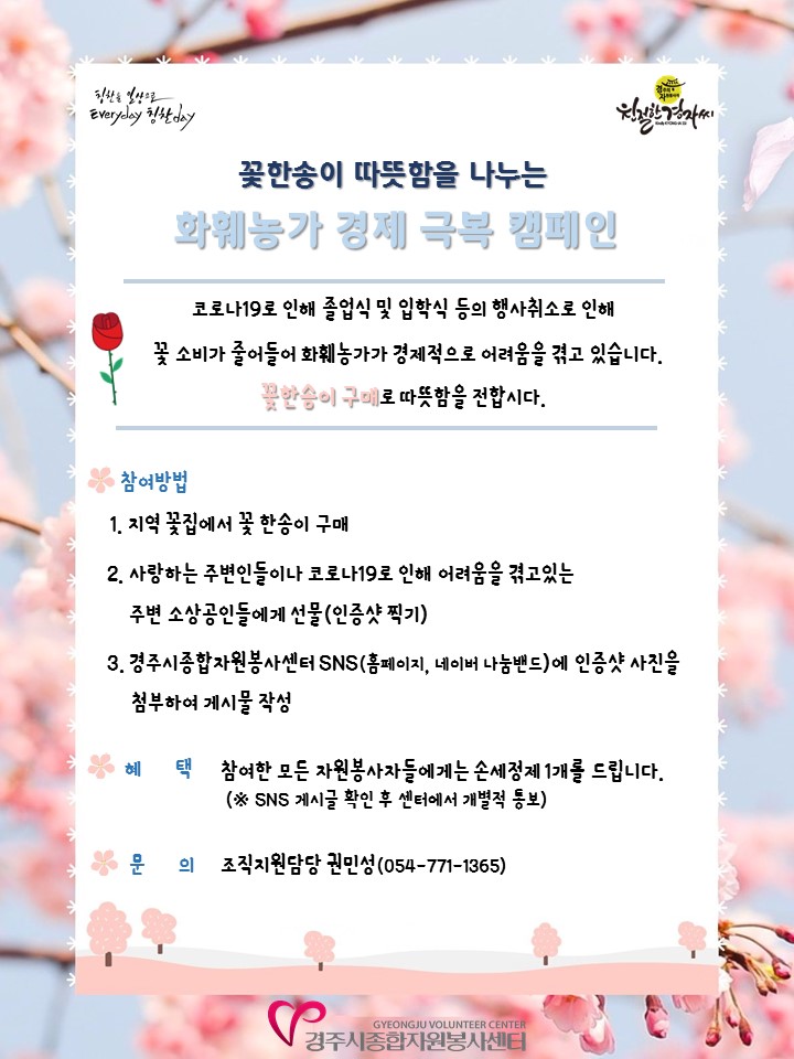 【경주=미디어인경북】 김동철 기자 = (사)경주시종합자원봉사센터(이사장 조문호)는 지난 5일부터 ‘화훼농가 경제 극복 캠페인’을 실시한다.