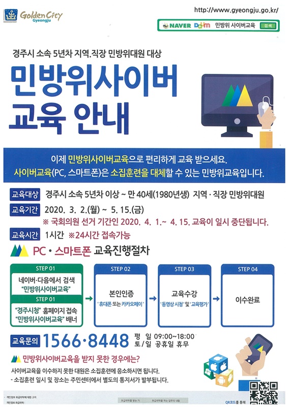 【경주=미디어인경북】 김동철 기자 = 경주시는 코로나19 확산 방지를 위해 매년 3월부터 실시하던 1~4년차 민방위대원 집합교육을 4월 국회의원 선거 이후로 연기했다.
