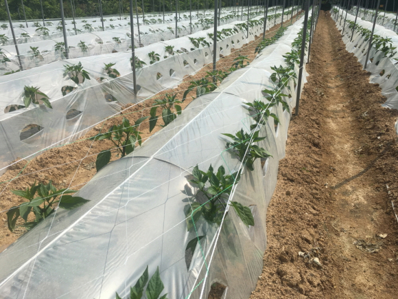 올해 과제로 선정된 ‘고추 초경량 부직포 터널재배’는 재배지에 물과 비료를 공급할 수 있는 관수호스를 설치, 고추 정식 후 강선(가는 철사)으로 소형터널을 만들고 그 위에 그물망과 일반 부직포(40g/㎡)보다 얇은 초경량 부직포(18g/㎡)를 씌워 재배하는 방식이다.