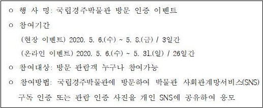 이번 행사는 오는 5월 6일(수)부터 진행하며, 국립경주박물관에 방문하여 박물관 사회관계망서비스(SNS) 채널에 구독을 인증한 관람객에게 5월 8일까지 매일 선착순 150명에게 휴대용 손 소독제를 제공한다. 온라인에서는 5월 31일(일)까지 코로나19 예방을 위한 관람 수칙을 지키고 관람 인증한 사진을 개인 사회관계망서비스에 공유한 관람객을 대상으로 추첨하여 5명에게 폴라로이드 카메라를 경품으로 증정할 예정이다.