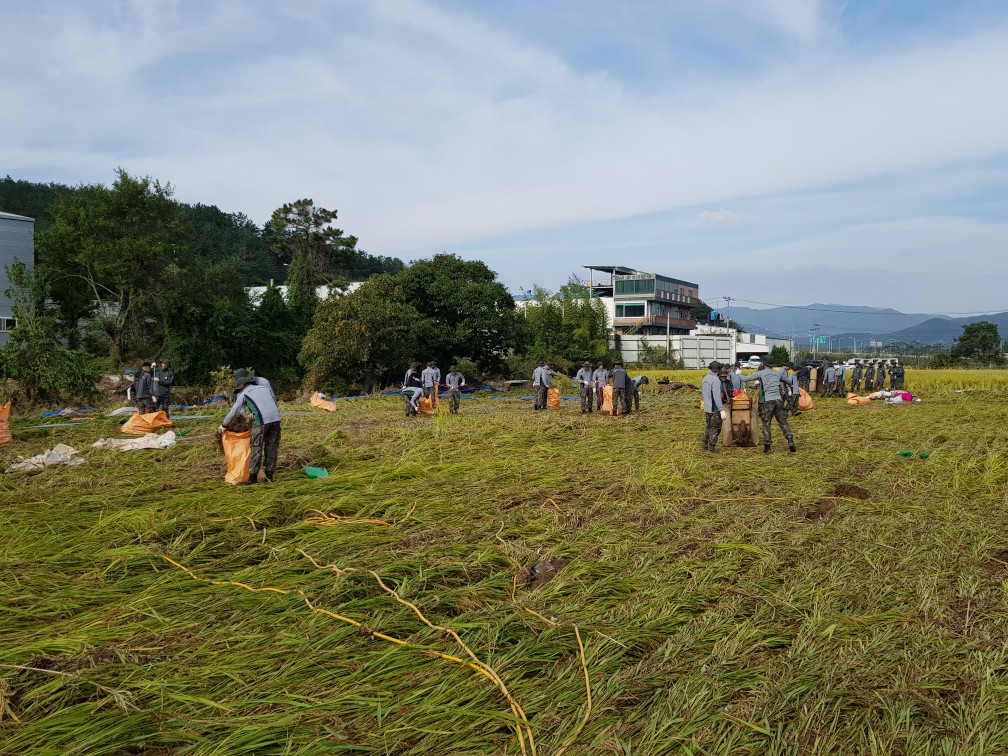 | ↑↑ ▲경주시 통합방위협의회, 국방부장관상 수상(장병들이 태풍피해로 누운 벼를 일으켜세우고 있다) |
