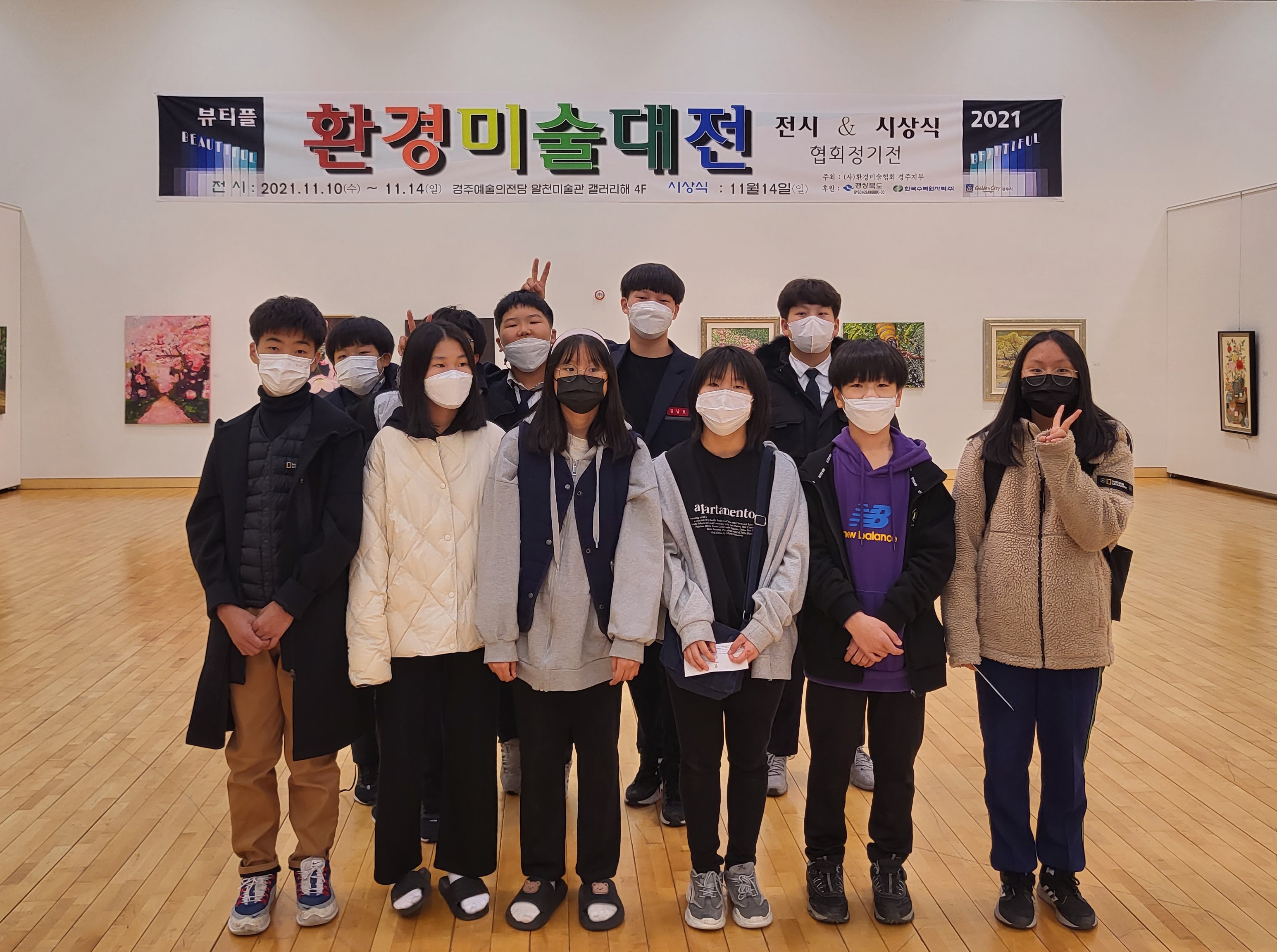 | ↑↑ ▲지난 10일 환경미술협회 경주지부가 주최하는 제15회 뷰티풀 환경미술공모전에 참여해 금·은·동상과 특별상을 수상한 두빛나래 학생들이 기념촬영을 하고 있다. |