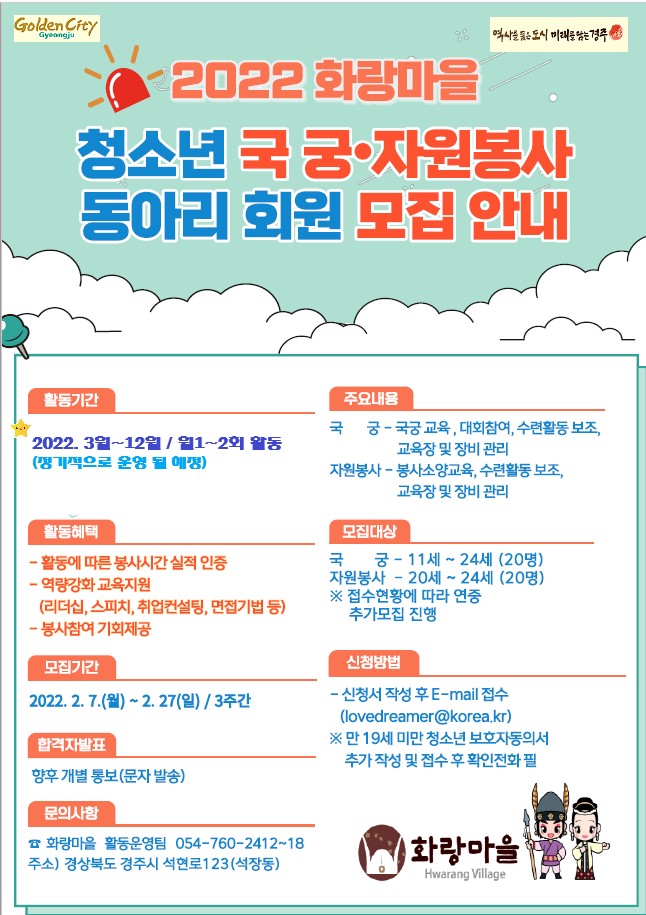 한편 지난해 화랑마을 청소년 동아리는 해오름 동맹 청소년 문화교류 활동 참여, 국궁 정기체험 자원봉사 등 코로나19 상황에서도 다양한 활동을 펼친 바 있다.