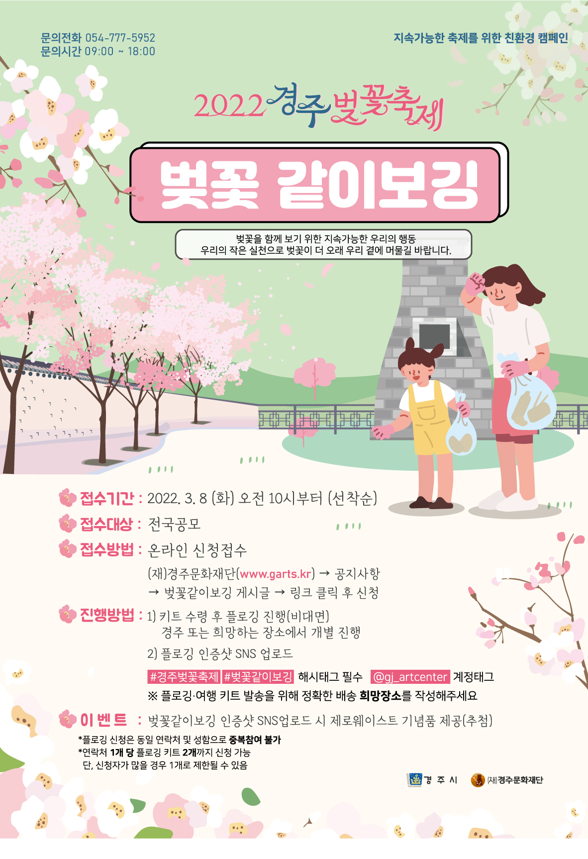 【경주=미디어인경북】 김동철 기자 = ‘2022 경주벚꽃축제’ 친환경 플로깅 <벚꽃같이보깅> 참가자 모집을 3월 8일부터 시작한다.
