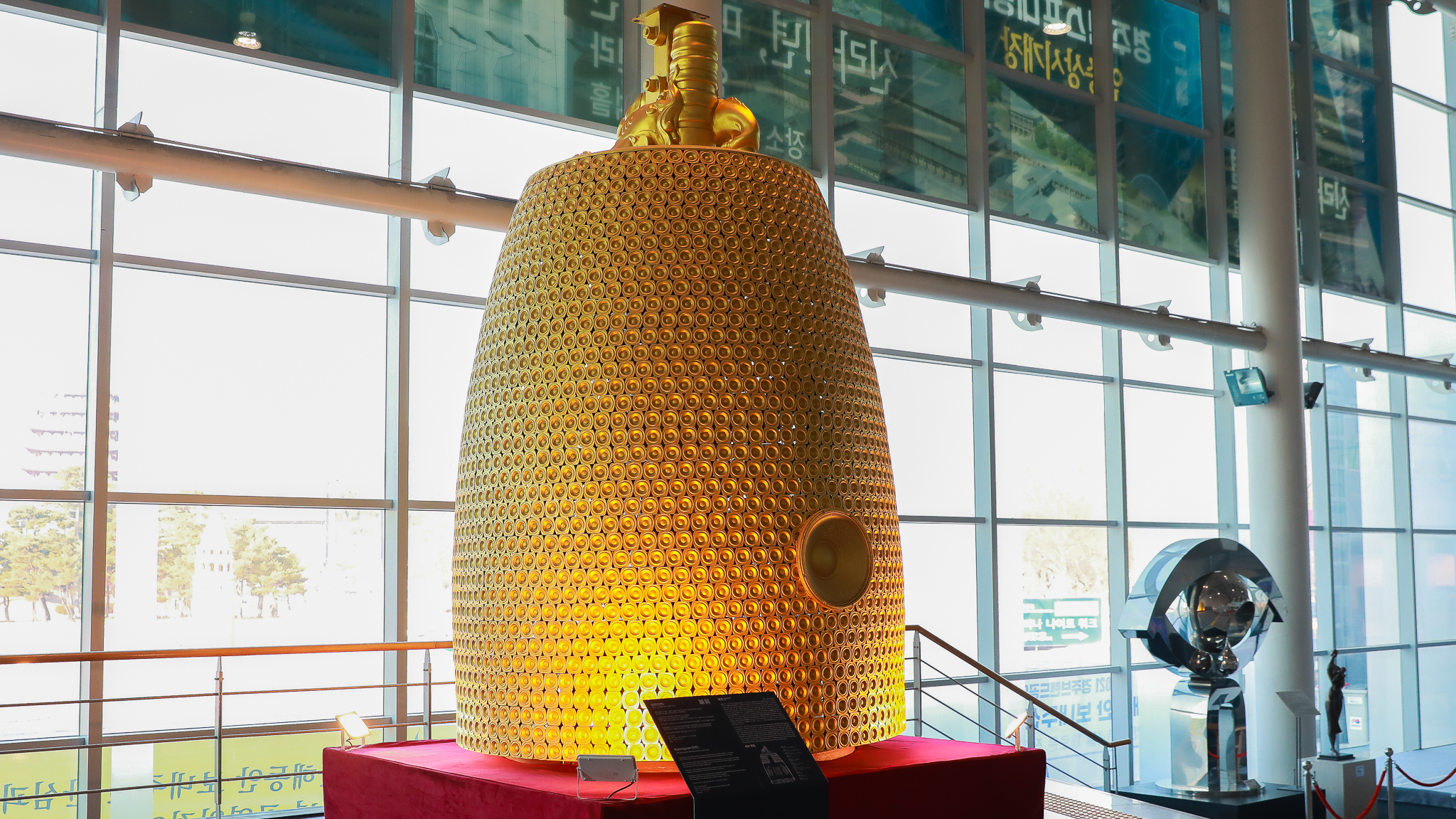 작품 앞 발판 위에 올라서면 높이 3.7m 폭 2.3m의 규모의 거대한 황금 빛 종으로 변신한 3,088개의 스피커에서 나오는 장엄한 소리의 감동을 온몸으로 느낄 수 있다.