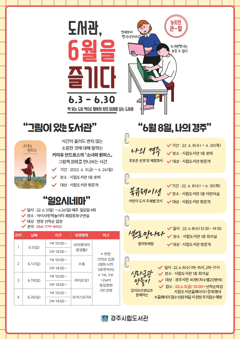 【경주=미디어인경북】 김동철 기자 = 경주시립도서관은 다음달 8일 경주시민의 날을 기념해 6월 한달간 다채로운 행사를 운영한다고 30일 밝혔다.