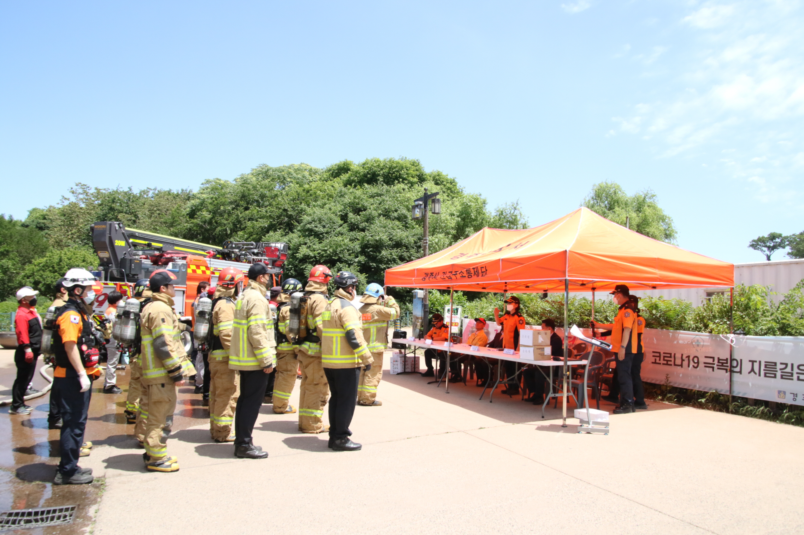 또한 향교 동편 주차된 차량에서 원인 미상의 화재가 발생, 강풍으로 인해 연소 확대 되고 있는 상황을 가정해 ▲상황전파 및 인명유도・대피 ▲자위소방대 화재 초기 진화 및 중요물품 반출 ▲소방차량의 합동 방수 훈련 순서로 진행됐다.