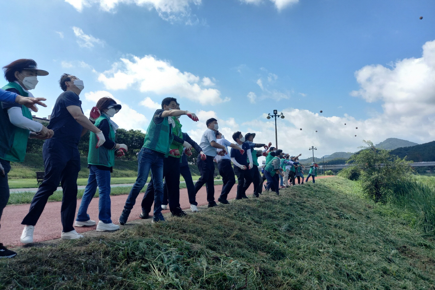 | 경주시 새마을회원들이 지난 12일 경주 황성대교 일원 형산강변에서 수질을 개선하기 위해 EM 흙공을 던지고 있다./ 사진제공=경주시 |