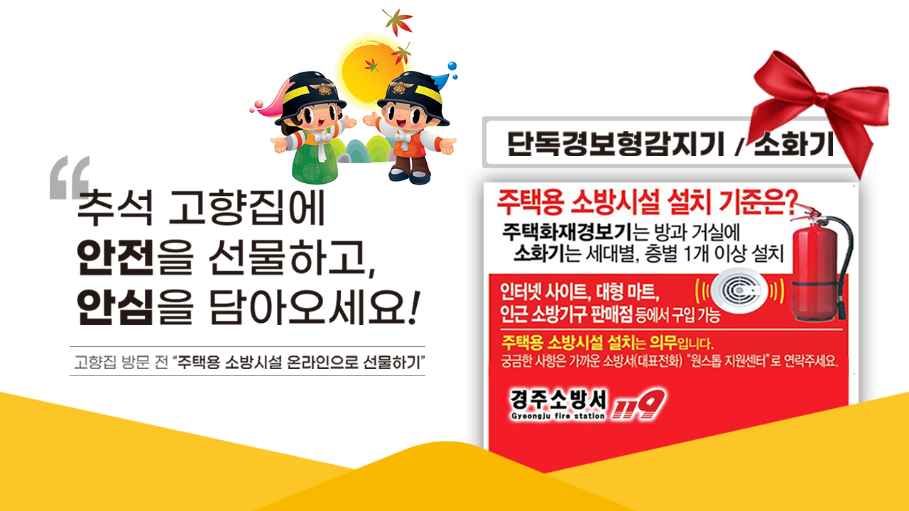 [경주=미디어인경북, 김동철 기자] 경주소방서(서장 한창완)는 민족 최대명절 추석을 앞두고 주택 화재로 인한 인명·재산피해를 예방하기 위해 고향집 주택용 소방시설 선물하기 집중홍보에 적극 나선다.