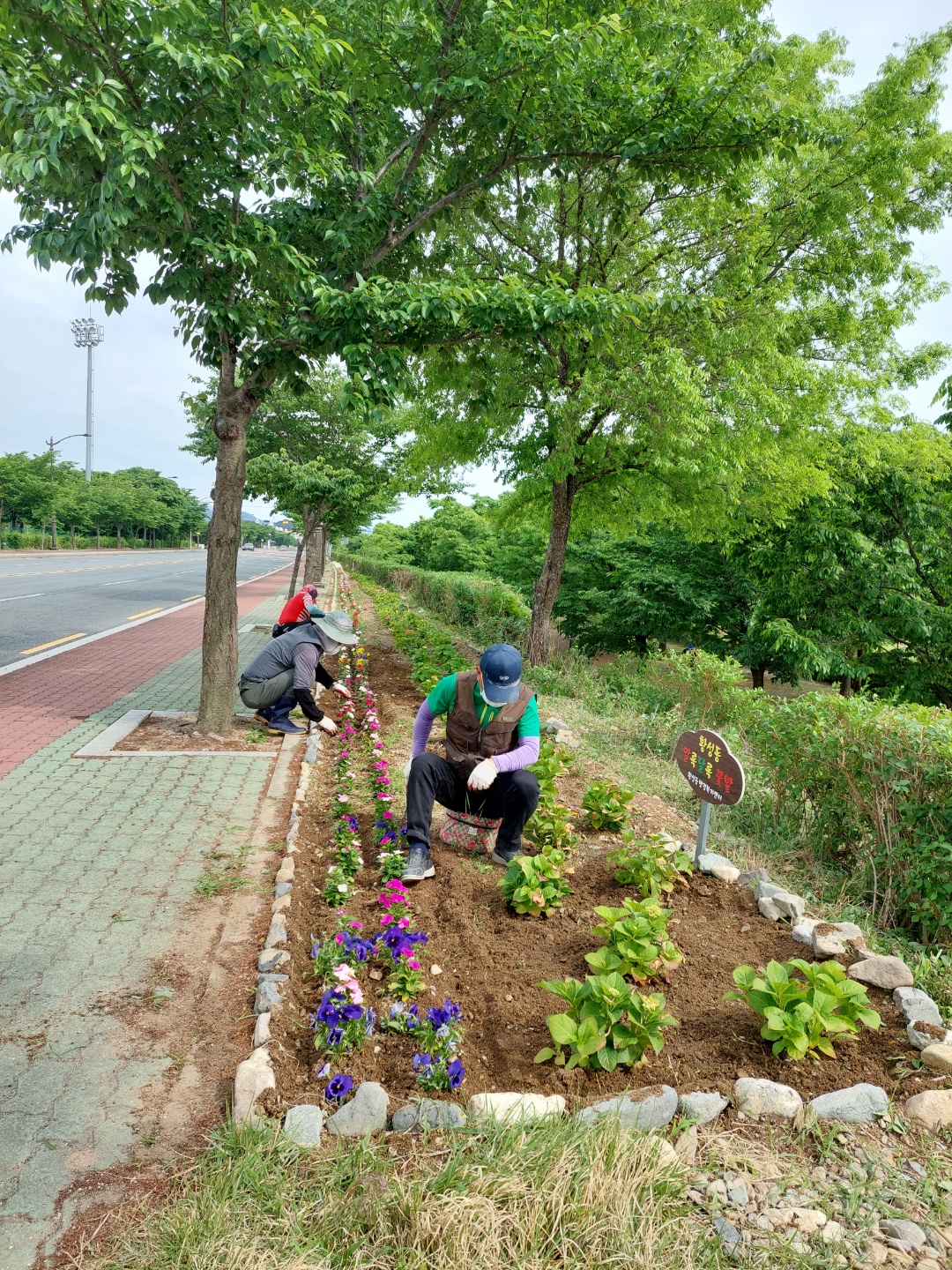| 올 상반기 황성동행정복지센터로 배정된 공공근로사업 참여자들이 꽃길 가꾸기 사업에 한창이다./ 경주시(사진제공) |