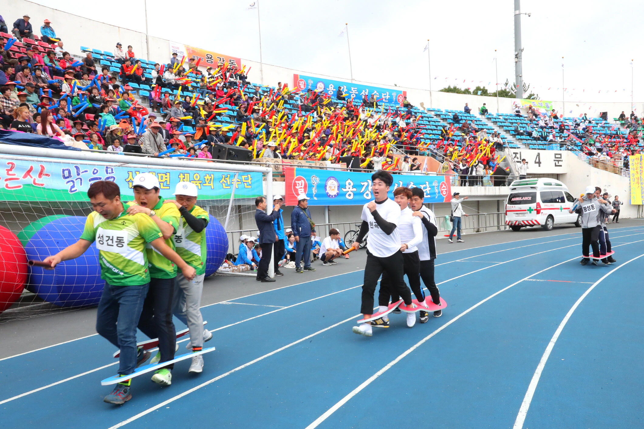 | 지난 2018년 개최된 시민체육대회 읍면동 대항 2인3각 릴레이가 펼쳐지고 있다./ 경주시(사진제공) |