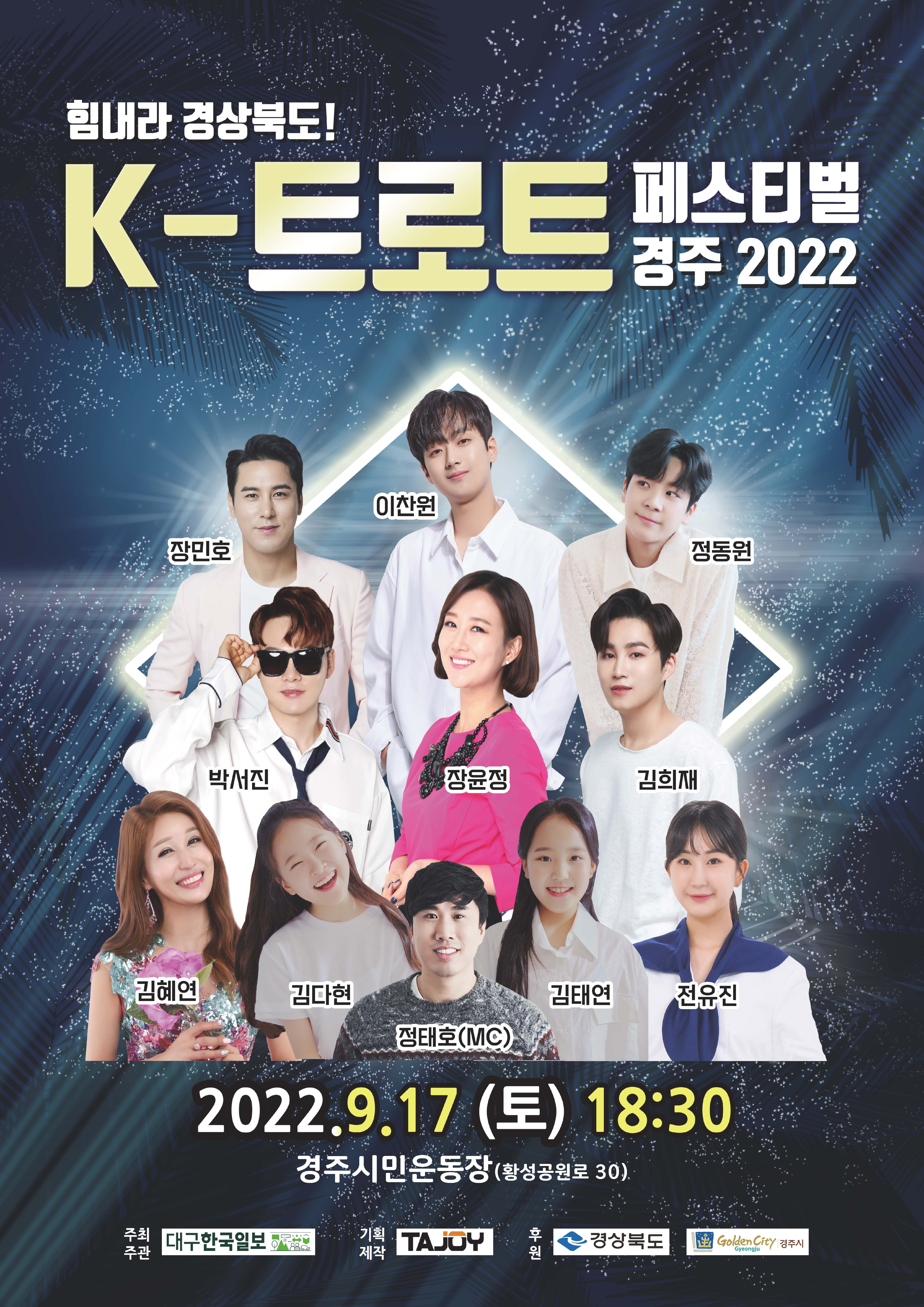 장윤정, 이찬원, 장민호, 정동원, 김혜연, 김희재 등 이름만 들어도 화려한 트로트 스타들이 총출동하는 ‘K-트로트 페스티벌 경주2022’ 공연이 오는 17일 오후 6시 30분 경주시민운동장에서 개최된다.