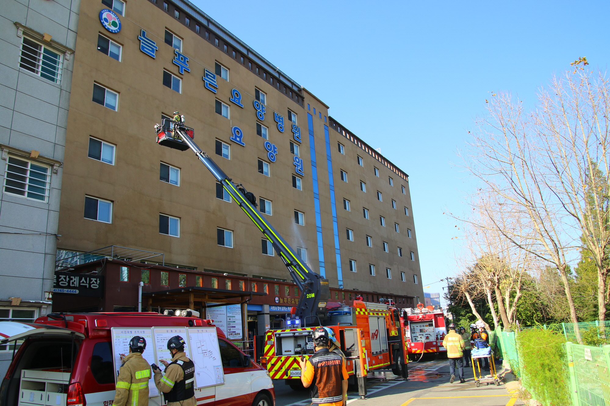 이날 훈련은 늘푸른요양병원의 화재 상황을 대비한 위기 대응 능력 확보를 위한 목적으로 화재 진압과 인명 구조, 긴급구조통제단 역할 분담 및 임무수행, 다수 사상자 발생 대비 응급체계 가동, 재난 상황 보고 및 복구·수습 등으로 진행됐다.