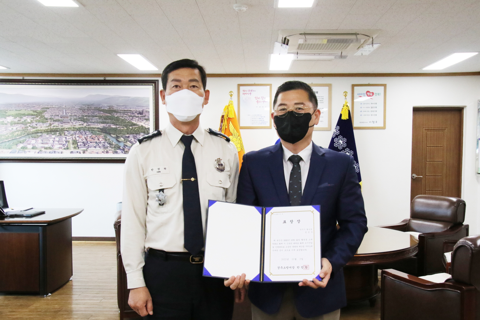 | ↑↑ 아파트 화재 초기 대응 유공시민 표창 전달(왼쪽 한창완 서장, 정연주씨)= 경주소방서(사진제공) |
