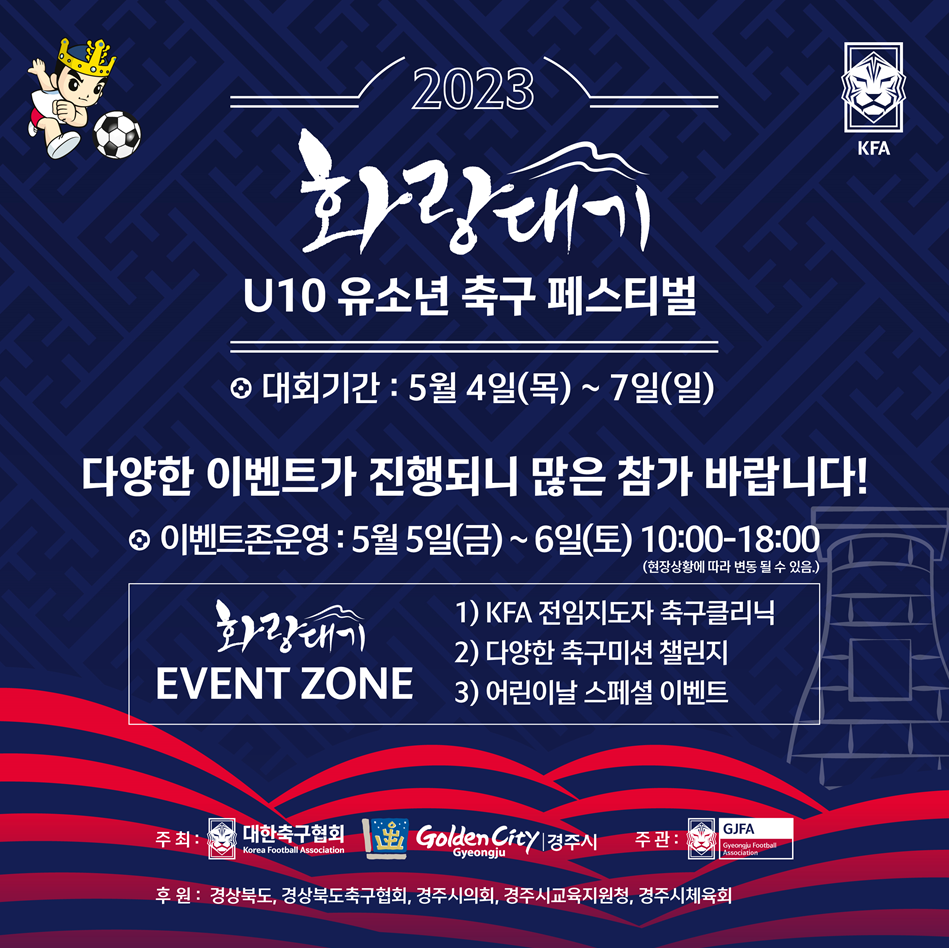 【경주=미디어인경북】 축구 꿈나무 등용문인 ‘2023 화랑대기 U-10 축구 페스티벌’이 이달 4일부터 7일까지 4일간 알천체육공원에서 펼쳐진다.