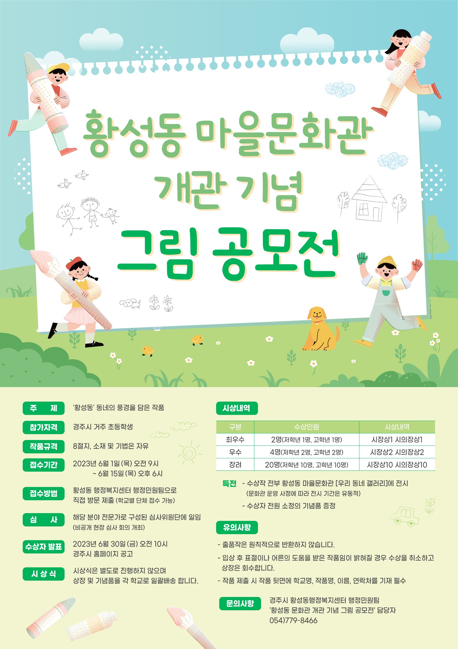 이번 공모전의 주제는 '황성동 동네의 풍경'이다. 경주시 거주하는 초등학생 누구나 참가할 수 있으며, 작품규격은 8절지이며, 소재와 기법은 자유다.