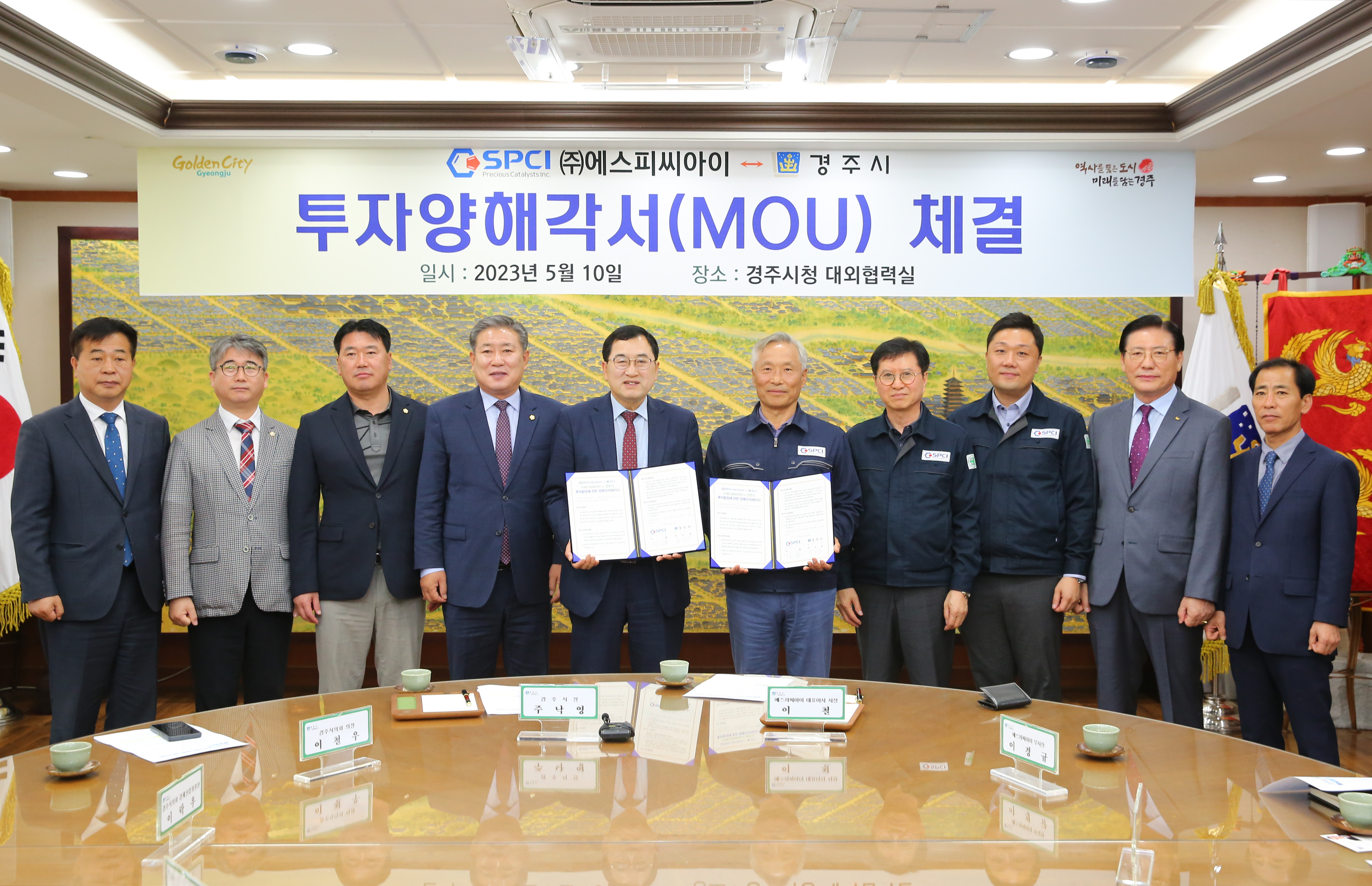 시는 10일 시청 대외협력실에서 ㈜에스피씨아이와 투자금액 630억, 50명의 신규 일자리창출을 핵심으로 안강 검단산단 내 메탈로센 촉매, 반도체용 전구체 등 반도체용 소재 전문생산 경주 3공장 증설 투자양해각서(MOU)를 체결했다.